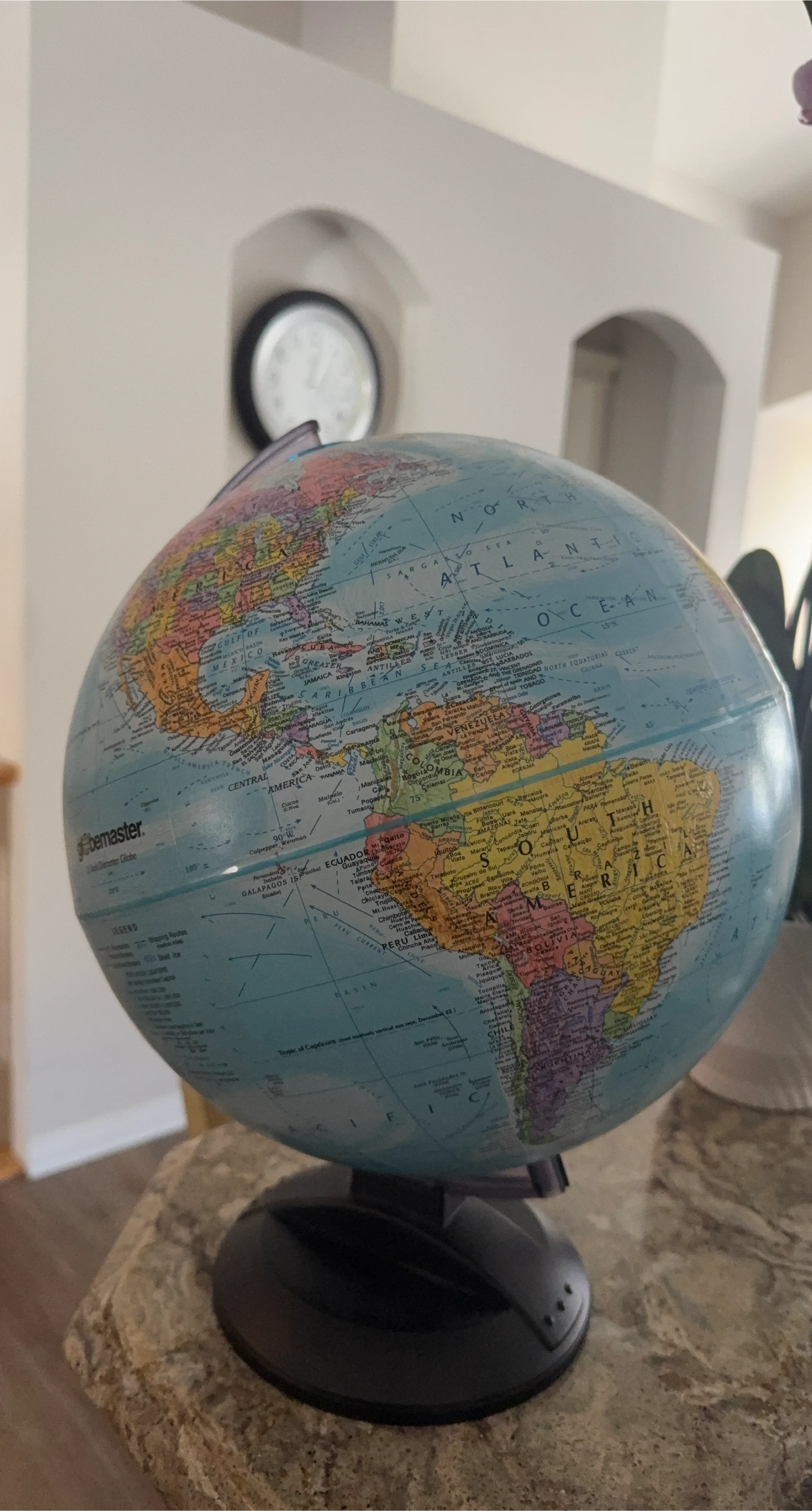 This is a Globemaster terrestrial globe showing continents and oceans. It includes a legend explaining shipping routes and ice. This globe would be useful for learning geography.