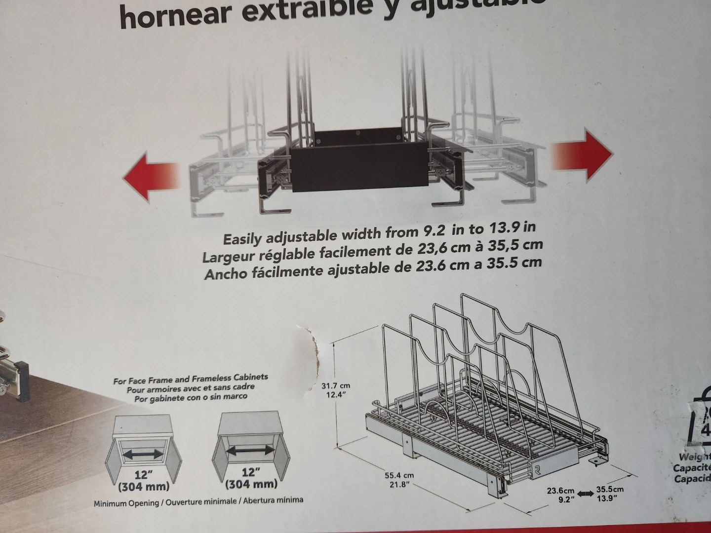 This adjustable pull-out pan divider is designed for kitchen cabinets. It offers an easily adjustable width from 9.2 to 13.9 inches. It's made with a chrome finish for durability.