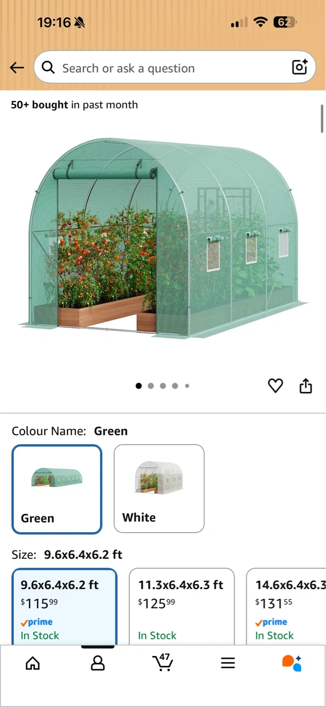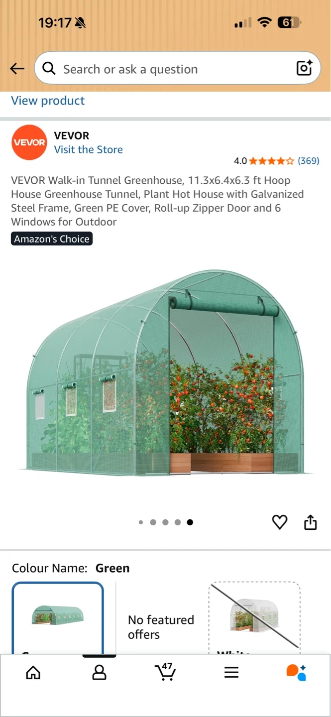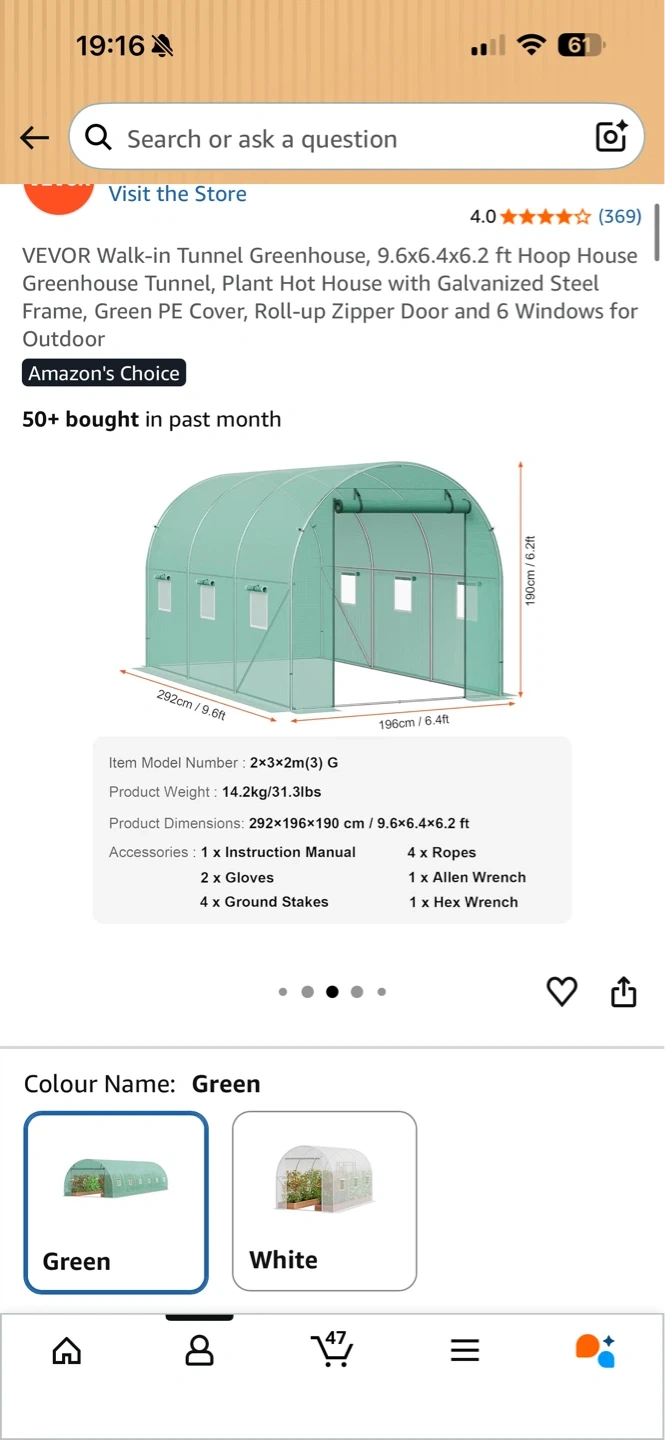 This VEVOR walk-in tunnel greenhouse is 9.6x6.4x6.2 ft and comes in green. It features a galvanized steel frame and PE cover. The greenhouse has a roll-up zipper door and 6 windows for ventilation. Includes instruction manual, ropes, gloves, alien wrench, and ground stakes.