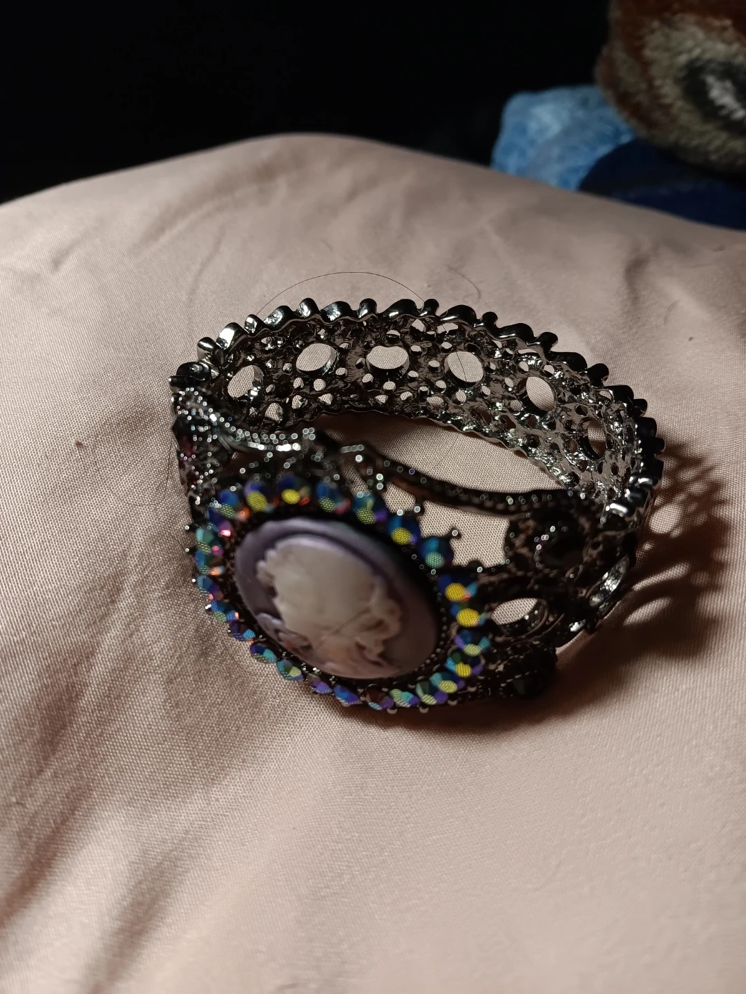 A vintage-inspired bangle bracelet featuring a purple cameo with a classic profile. It's adorned with colorful rhinestones around the center. The intricate metalwork adds an elegant touch.