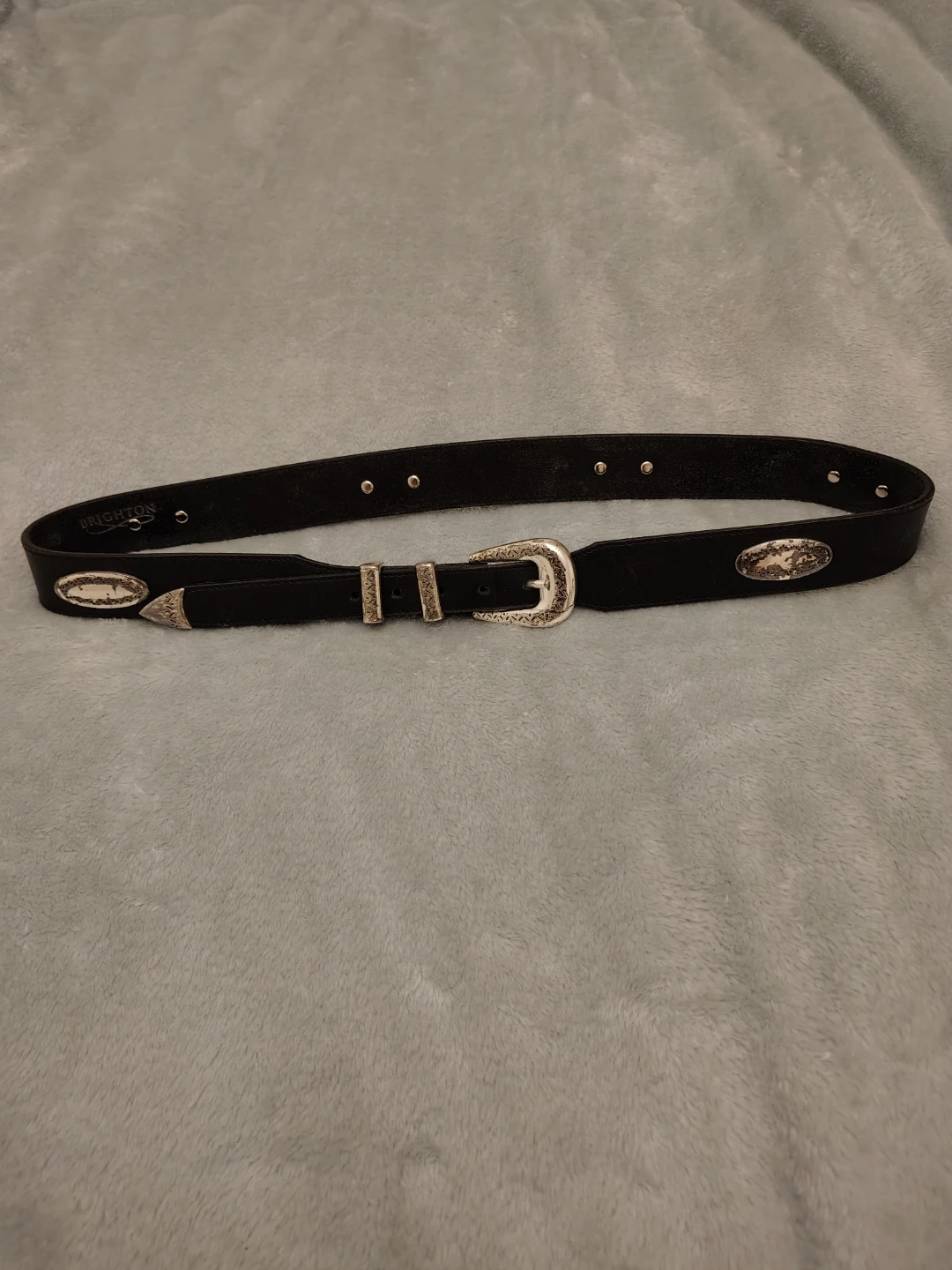 Black genuine leather belt by Brighton. Features a decorative silver buckle and ornate silver embellishments along the strap. It's a stylish accessory with a western flair.