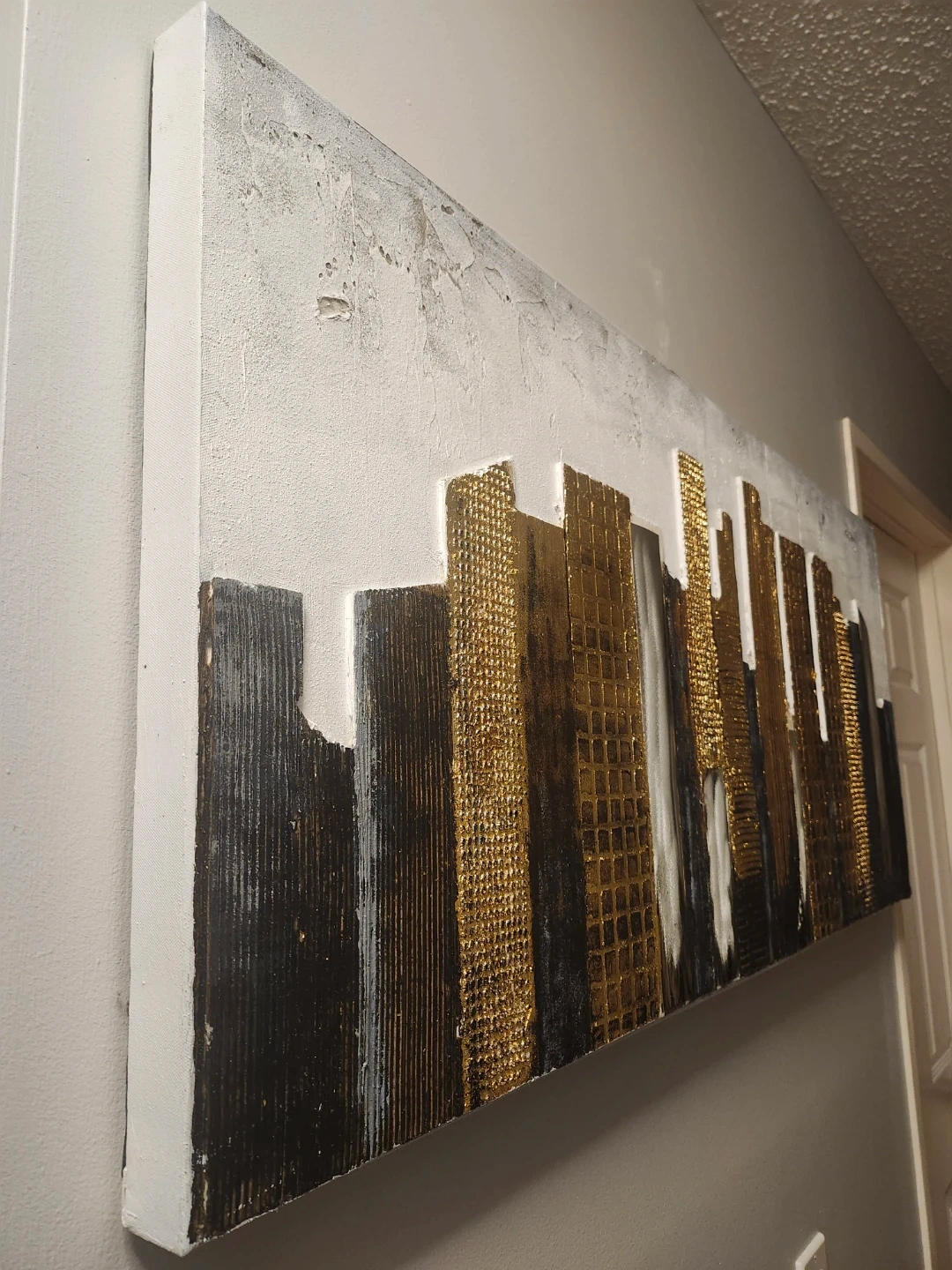 This textured wall art features a modern cityscape design with gold and black accents. It's a large canvas piece that adds a contemporary touch to any room. Great for living spaces or offices!