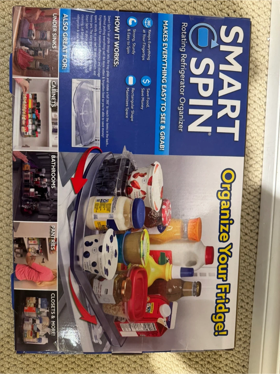 Organize your fridge with the Smart Spin rotating organizer! It makes everything easy to see and grab. It's strong, sturdy, and easy to spin. The air glide design lets the tray glide and rotate a full 360° to reach items in the back without pulling everything out! It helps save food and money