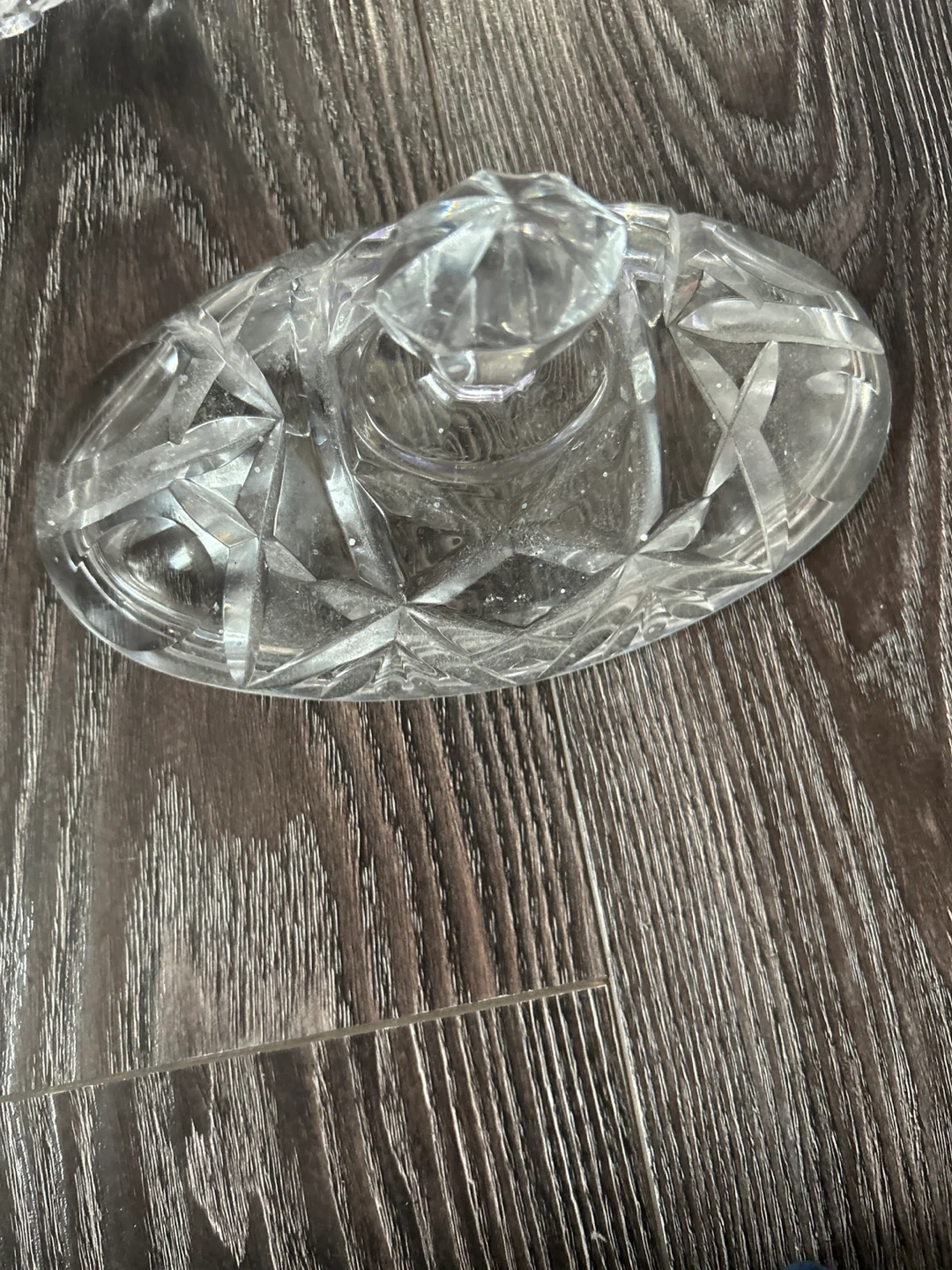 This is a beautiful glass candy dish with a lid and three small feet. It's perfect for serving candies or small treats at gatherings. The glass is clear and features a diamond-cut pattern. Cash or e-transfer only. No refunds.