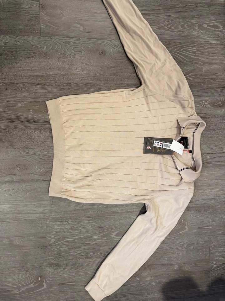 Brand new men's knit polo sweater with tags. Beige/sand color with a vertical ribbed knit design and a short zip/open collar. Soft, lightweight knit with ribbed hem and cuffs. Perfect for smart-casual outfits or layering in fall/spring.
