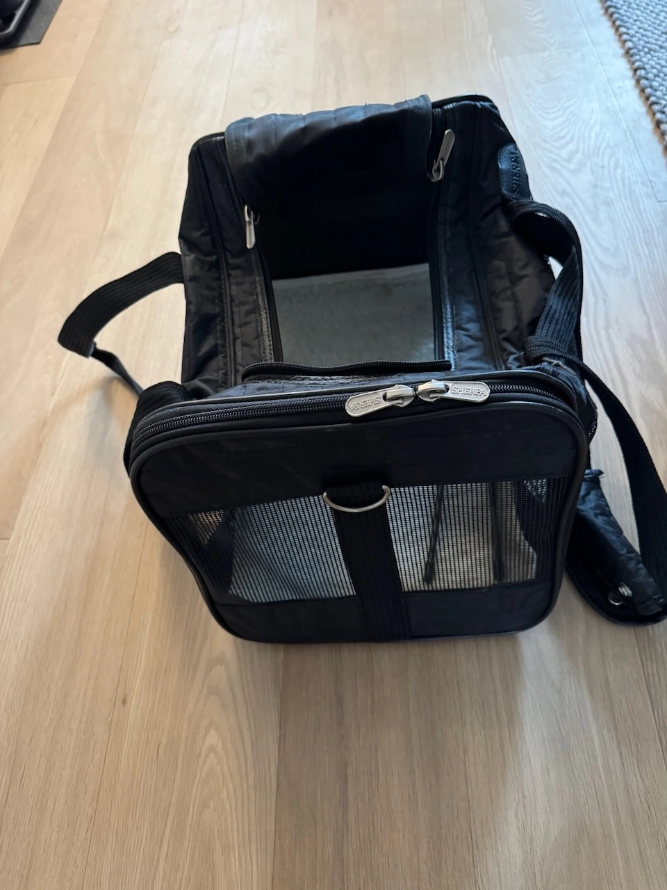Sherpa pet carrier. Nylon with metal Fram and mesh sides. Fits under airline seats.