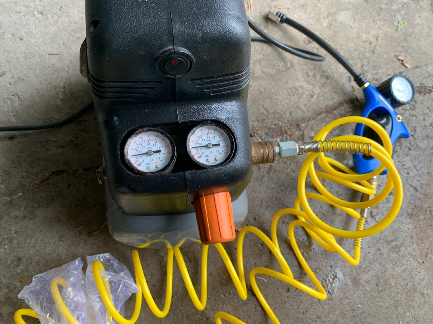 This is an HDX 2.0-gallon air compressor. It includes a coiled air hose and a tire inflator with a gauge. The compressor has two gauges to monitor pressure.