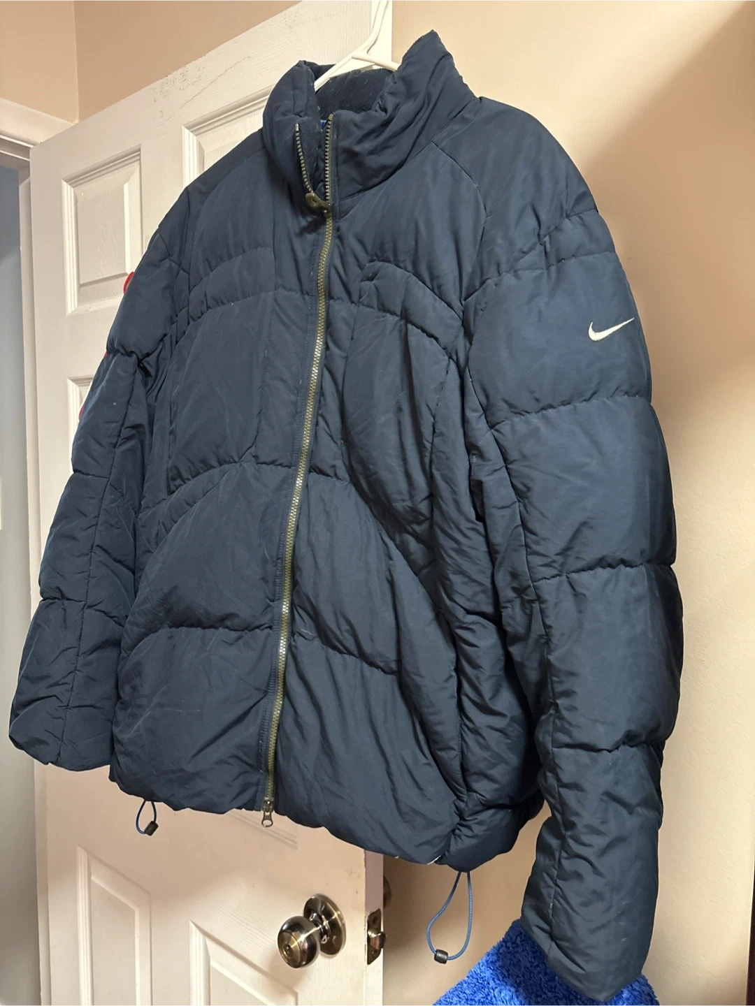 This is a navy blue Nike puffer jacket. It's made for warmth and comfort. The inside has a bright blue lining with a handy zippered pocket. Only wear it a few times
