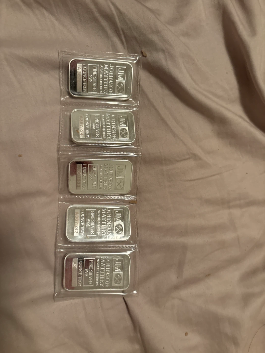 Five Johnson Matthey 1 oz fine silver bars. Each bar is stamped with '999 FINE SILVER' and the brand's logo. These bars are individually sealed. Minted by Assayers & Refiners.