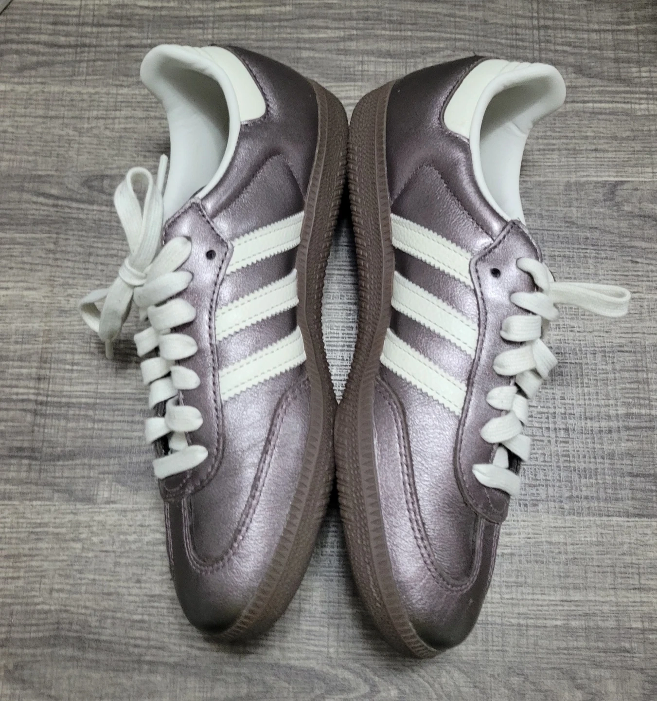 Classic Adidas Samba sneakers in a metallic pewter finish. They feature the iconic three stripes and comfortable interior. These shoes are stylish and versatile!