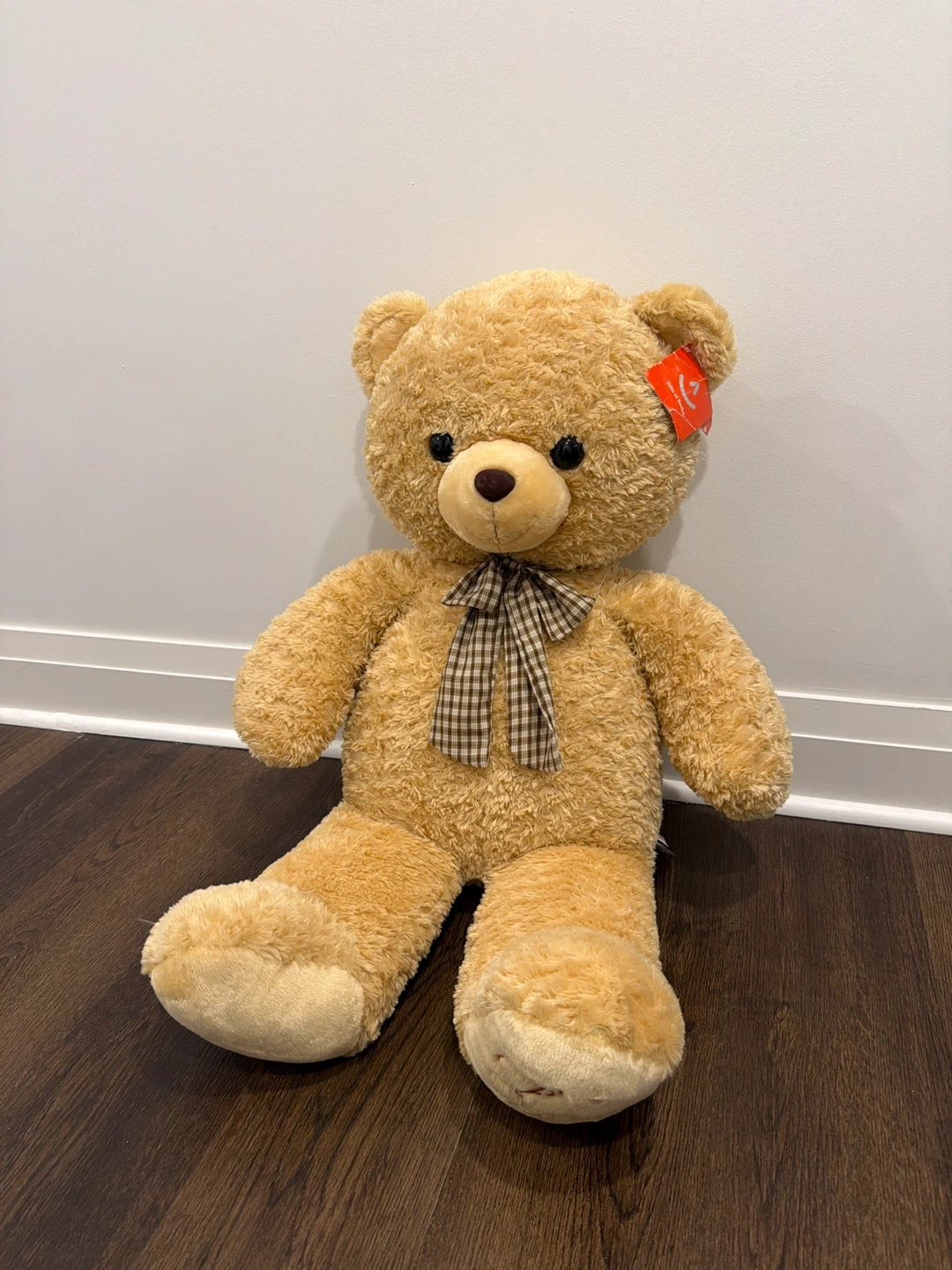 A big, fluffy, light brown teddy bear. It's wearing a classic plaid bow tie around its neck. Soft to the touch and perfect for hugging! Standing almost 3 ft.
