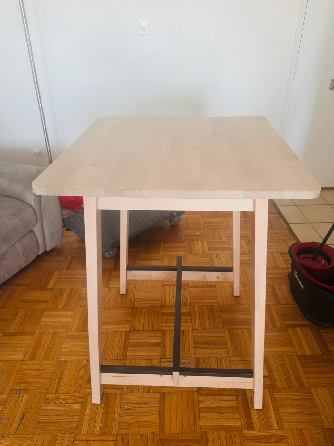 A simple dining table with a light wood finish. It's perfect for smaller dining spaces or as a breakfast nook table. This table's natural wood colour will fit into many decor styles.