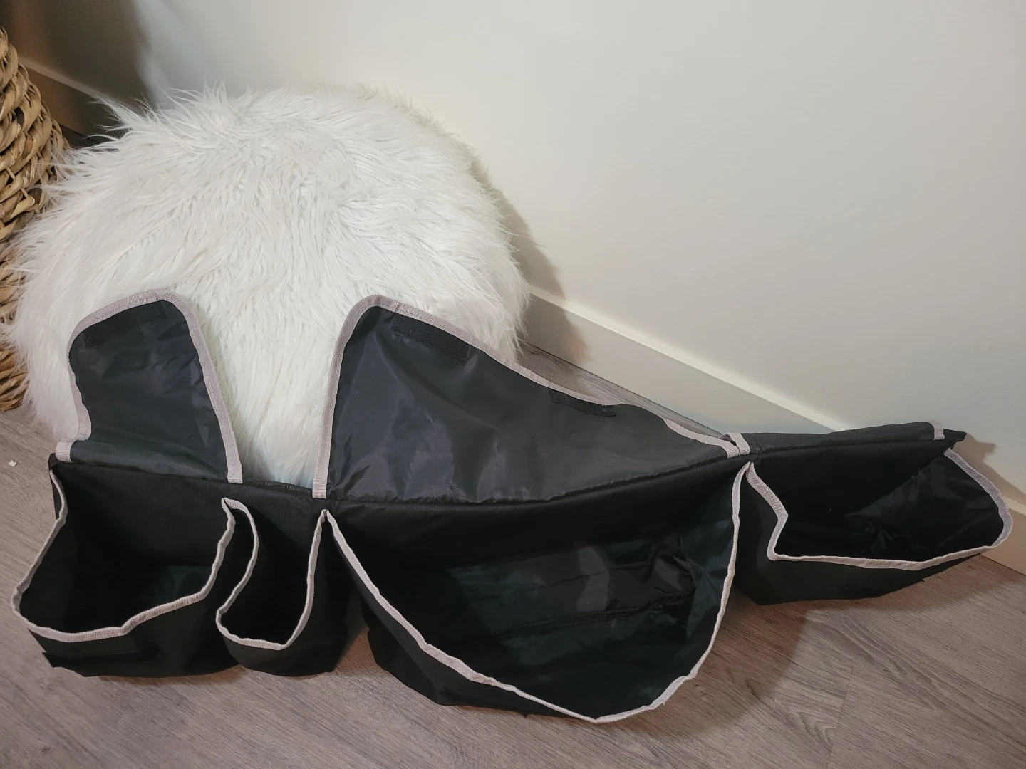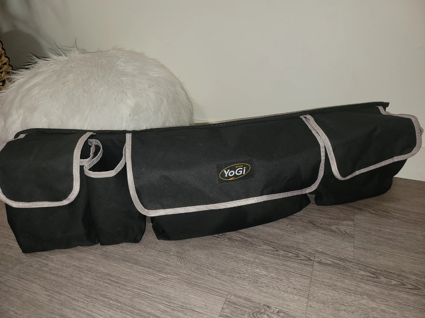 The YoGi Prime hanging car trunk organizer is a foldable, black polyester storage solution designed to maximize vehicle space.