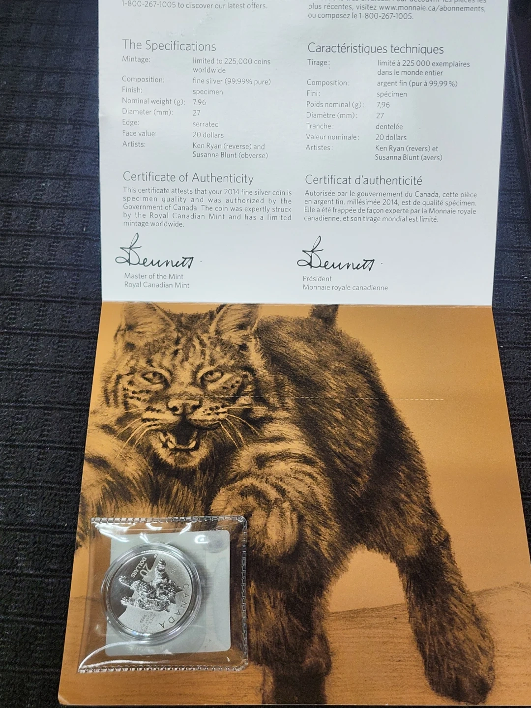 Selling a 2014 Canadian $20 fine silver coin featuring a bobcat. The coin is made of fine silver (99.99% pure) and weighs 7.96 grams. It has a face value of 20 dollars and was designed by artists Leo Rouss (reverse) and Susanna Blunt (obverse). Comes with a certificate of authenticity.