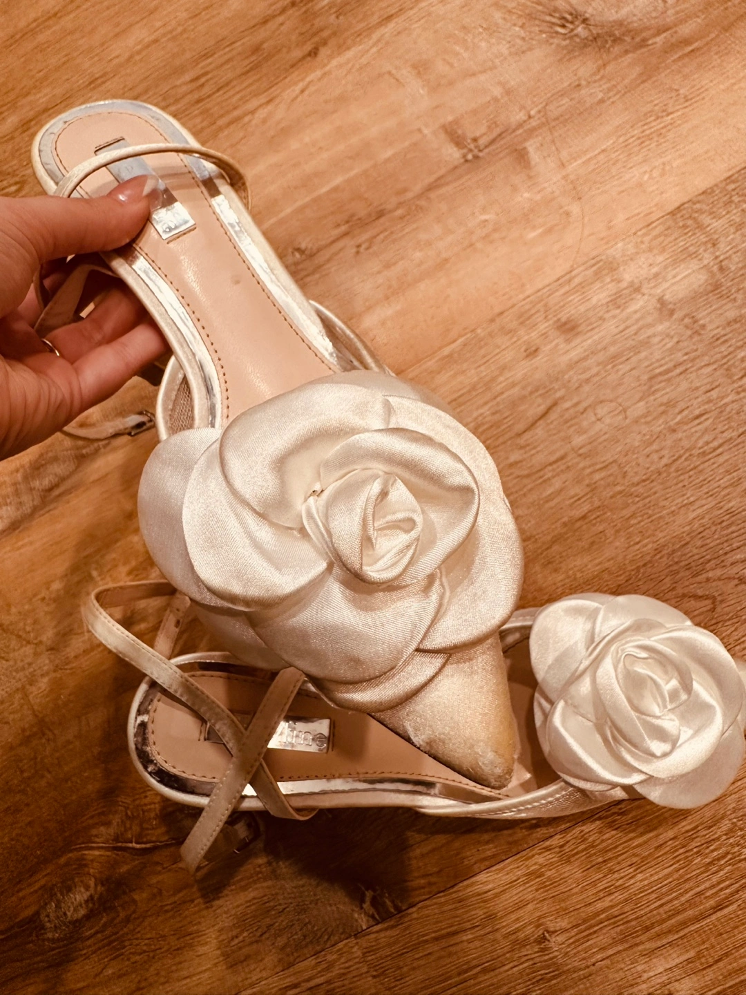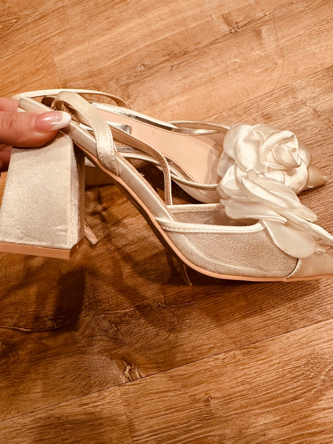 Beautiful ivory satin heels. Features a large rosette accent. Block heel. Ankle strap. I’m size 6.5 and they fit me perfectly