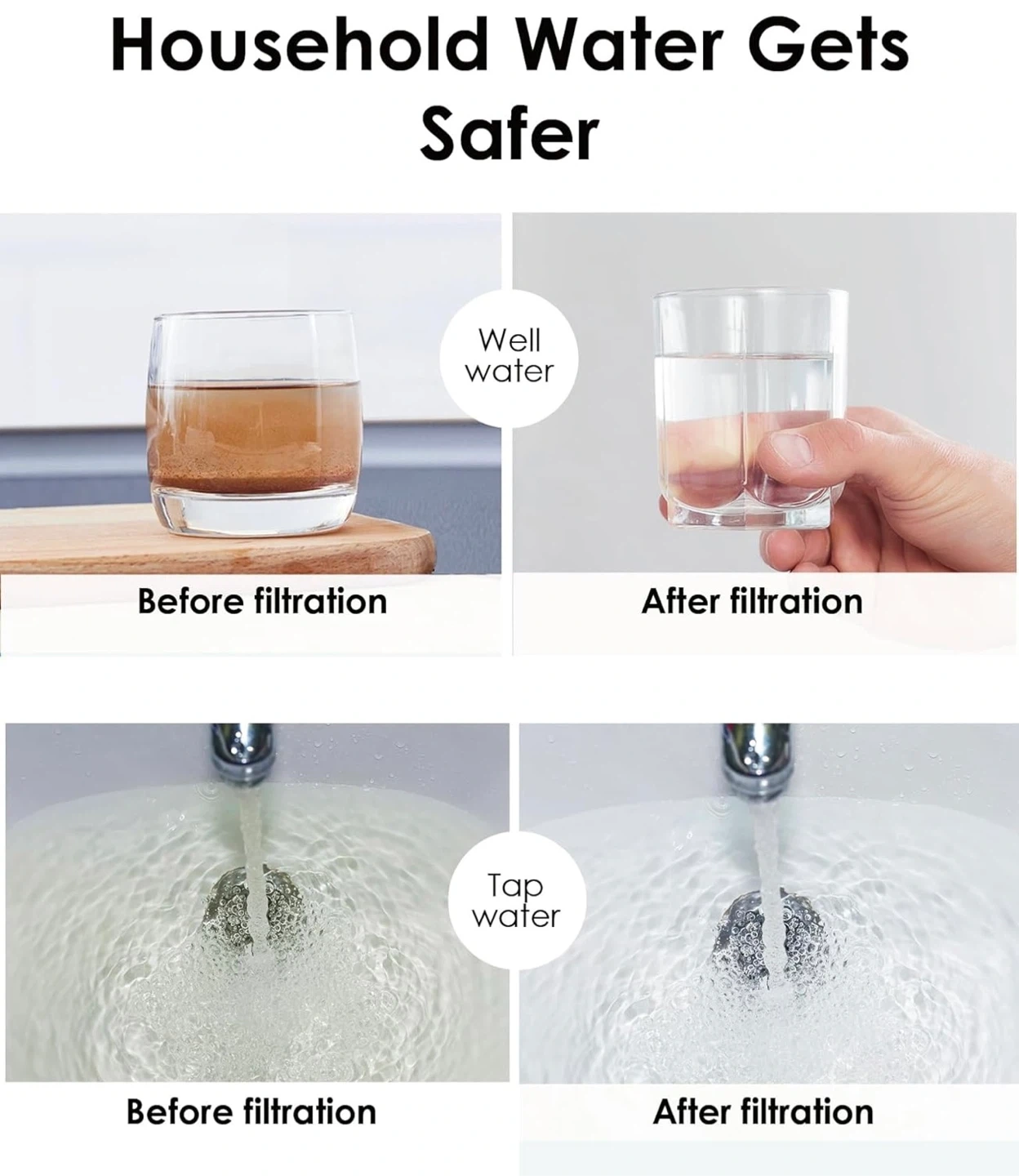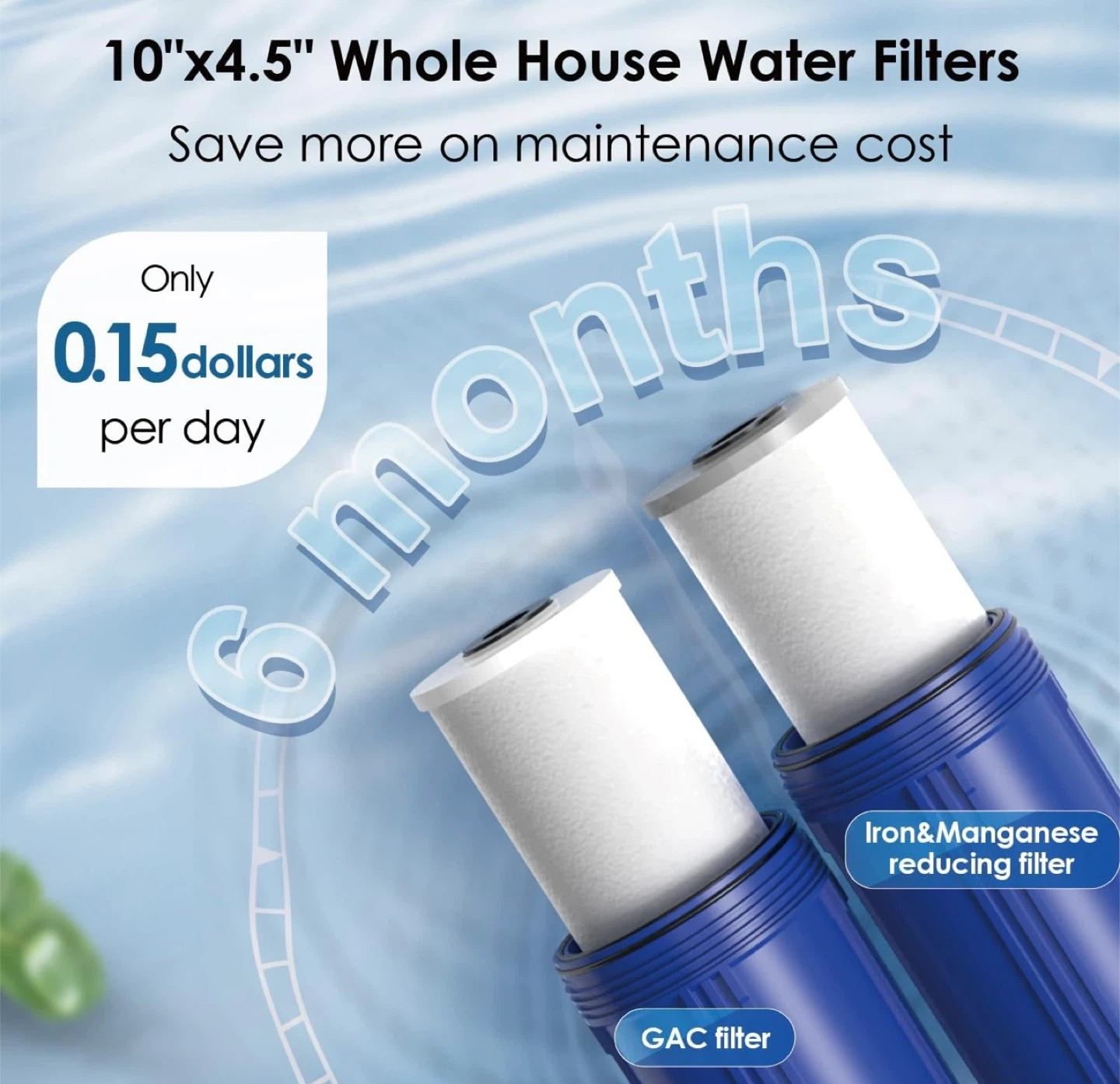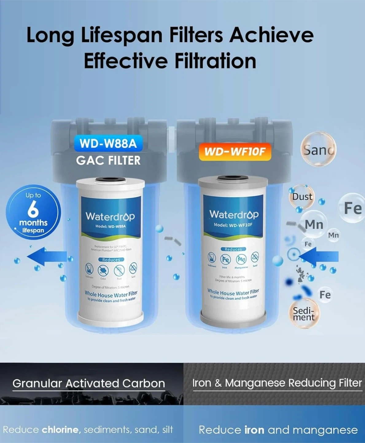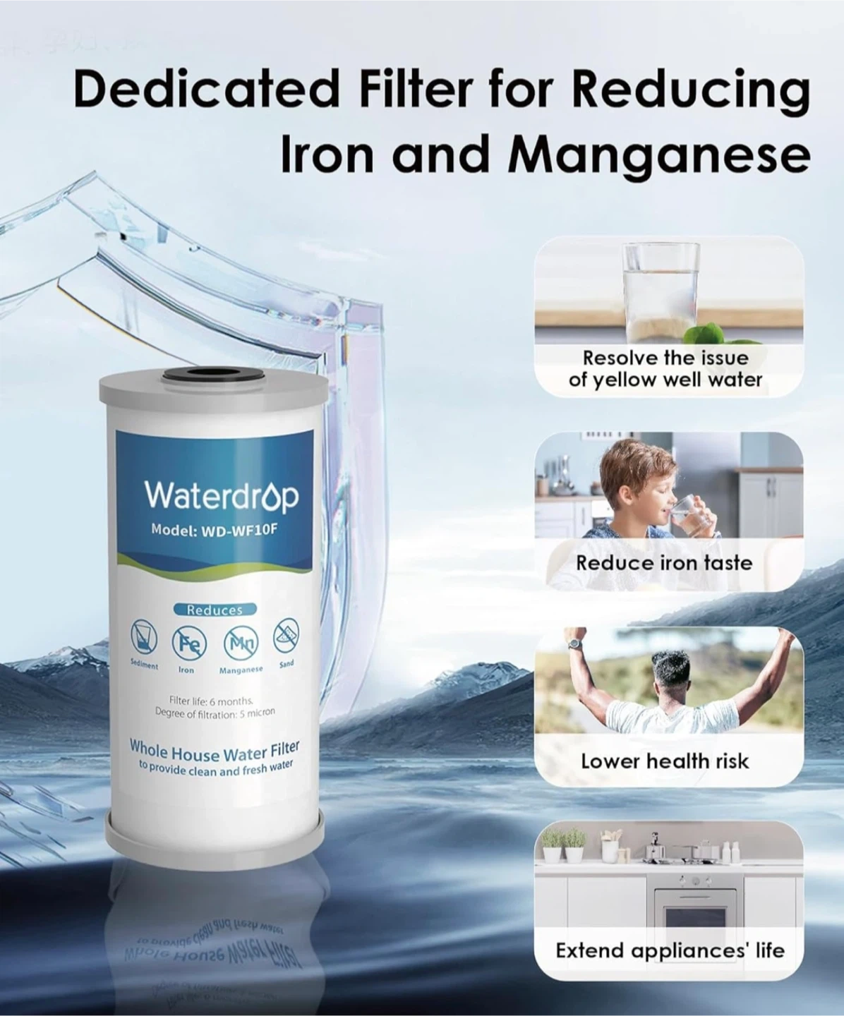 F this Waterdrop WD-WF10F whole house water filter reduces iron and manganese. It provides filtration for up to 6 months and has a degree of filtration of 5 microns. It's designed to provide clean and fresh water. This filter is useful for resolving yellow well water and reducing iron taste.