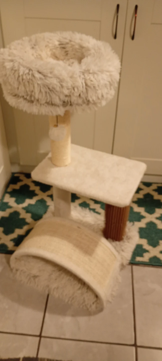 This cat tree condo offers multiple levels for your feline friend to play and rest. It features a plush top perch, a scratching post wrapped in sisal rope, and a lower platform. The soft, fuzzy material provides comfort for your cat. It's a great addition to any home with cats!