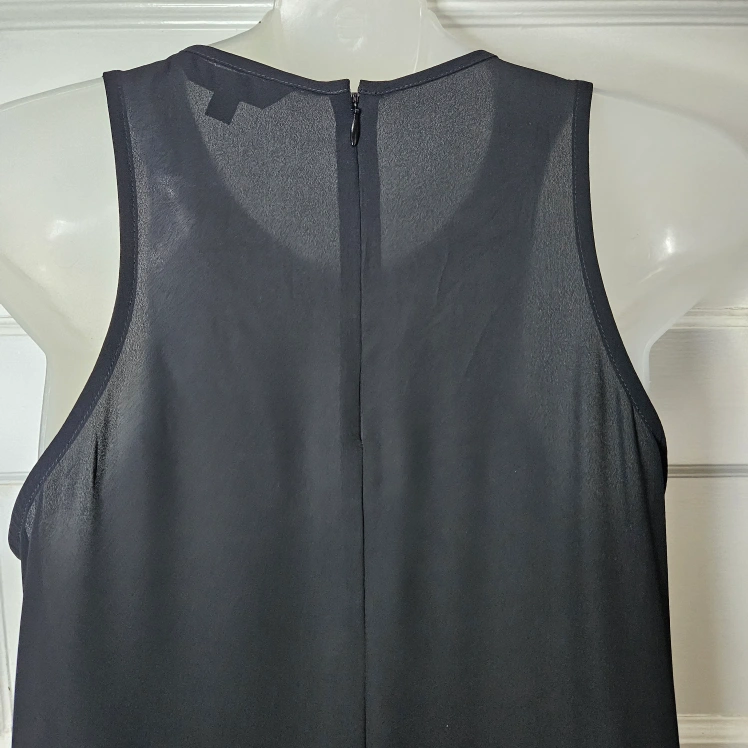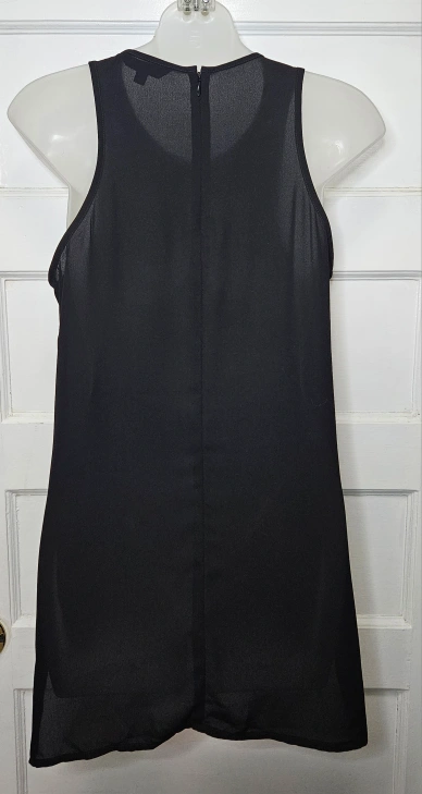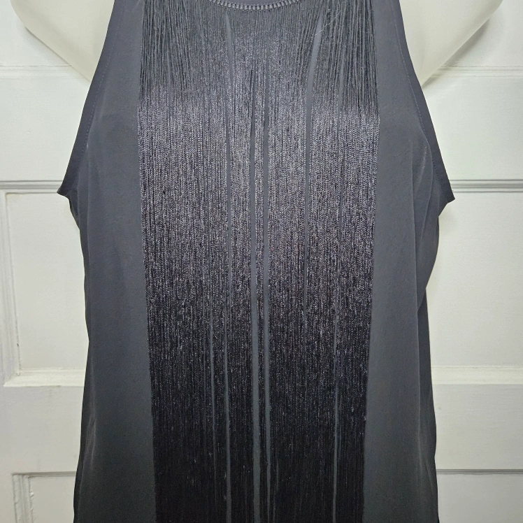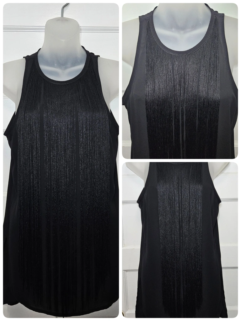 đź’›Express Tunic tank with long black fringe, side slits and is slightly sheer, but the fringe covers quite a bit. There is an invisible zipper in the back.