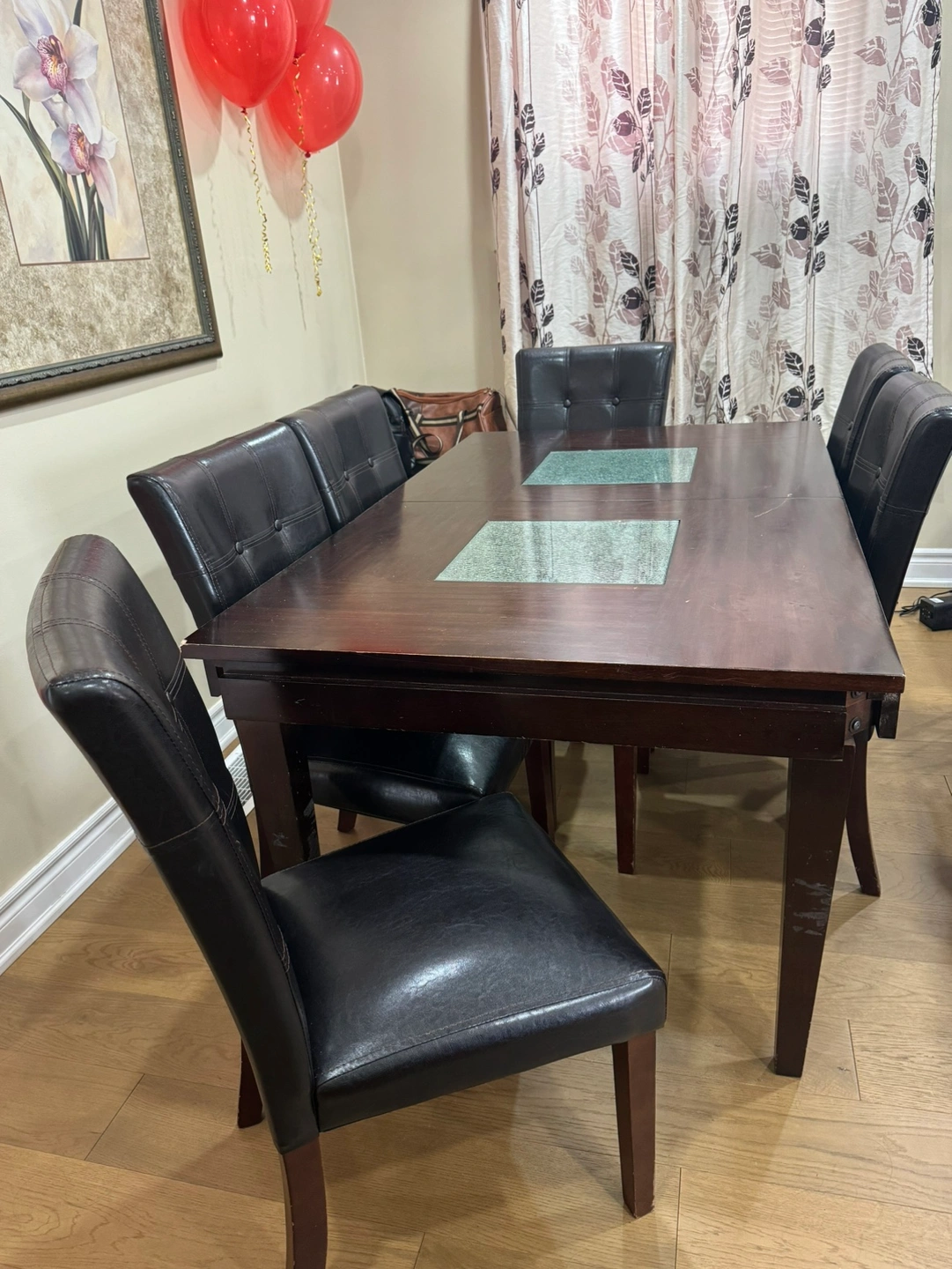 6 chairs and 1 table. Table has glass insert in centre. Table extension is also available. Chairs are upholstered in black faux leather.