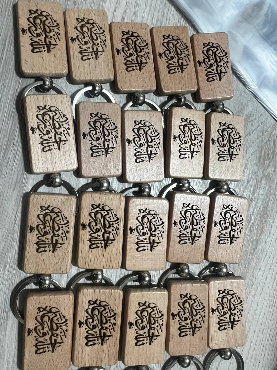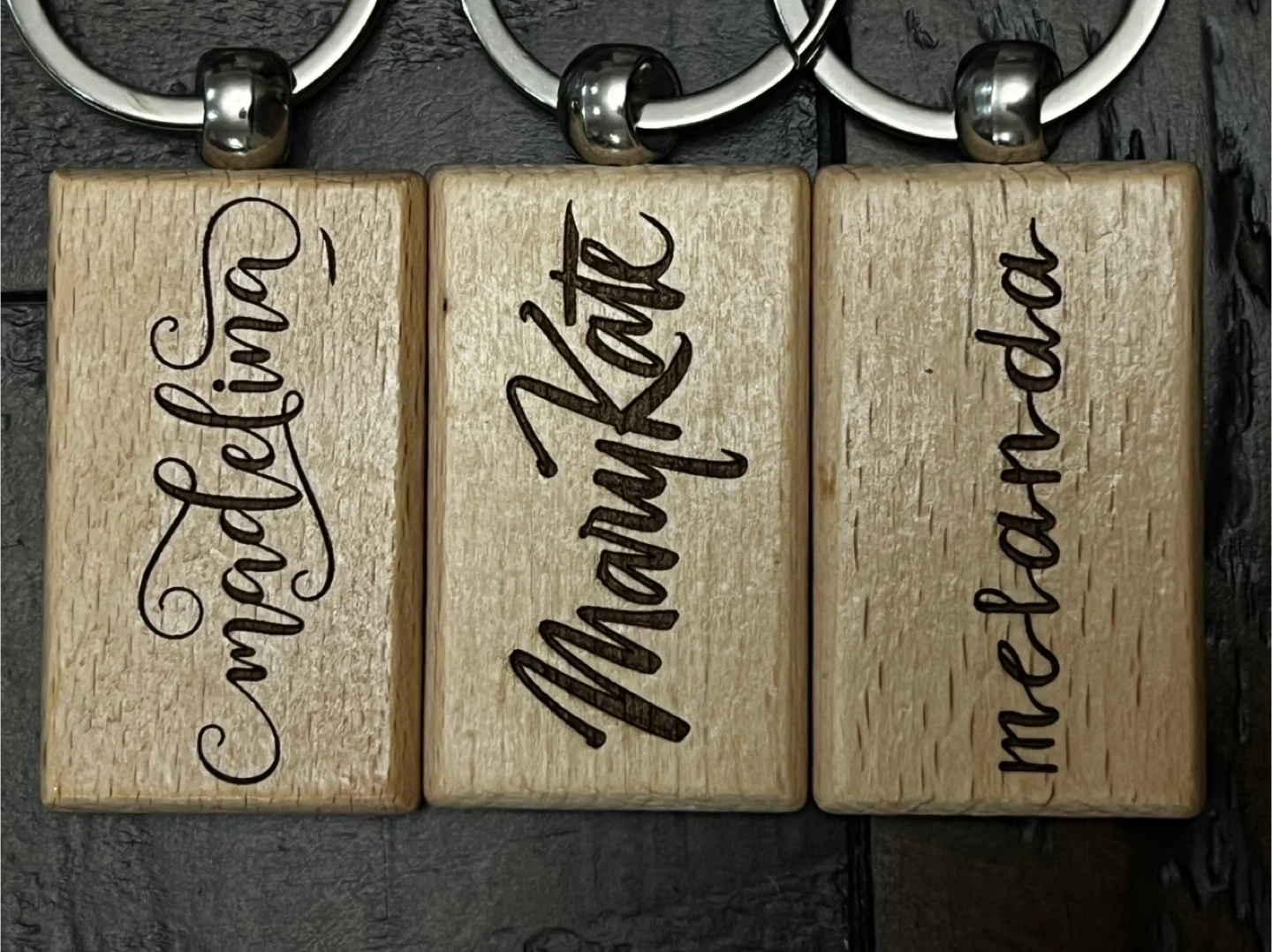 Selling custom engraved wooden keychains. These are perfect for personalizing your keys or as a thoughtful gift. Each keychain is unique with its own engraved design or name. They are made of wood.