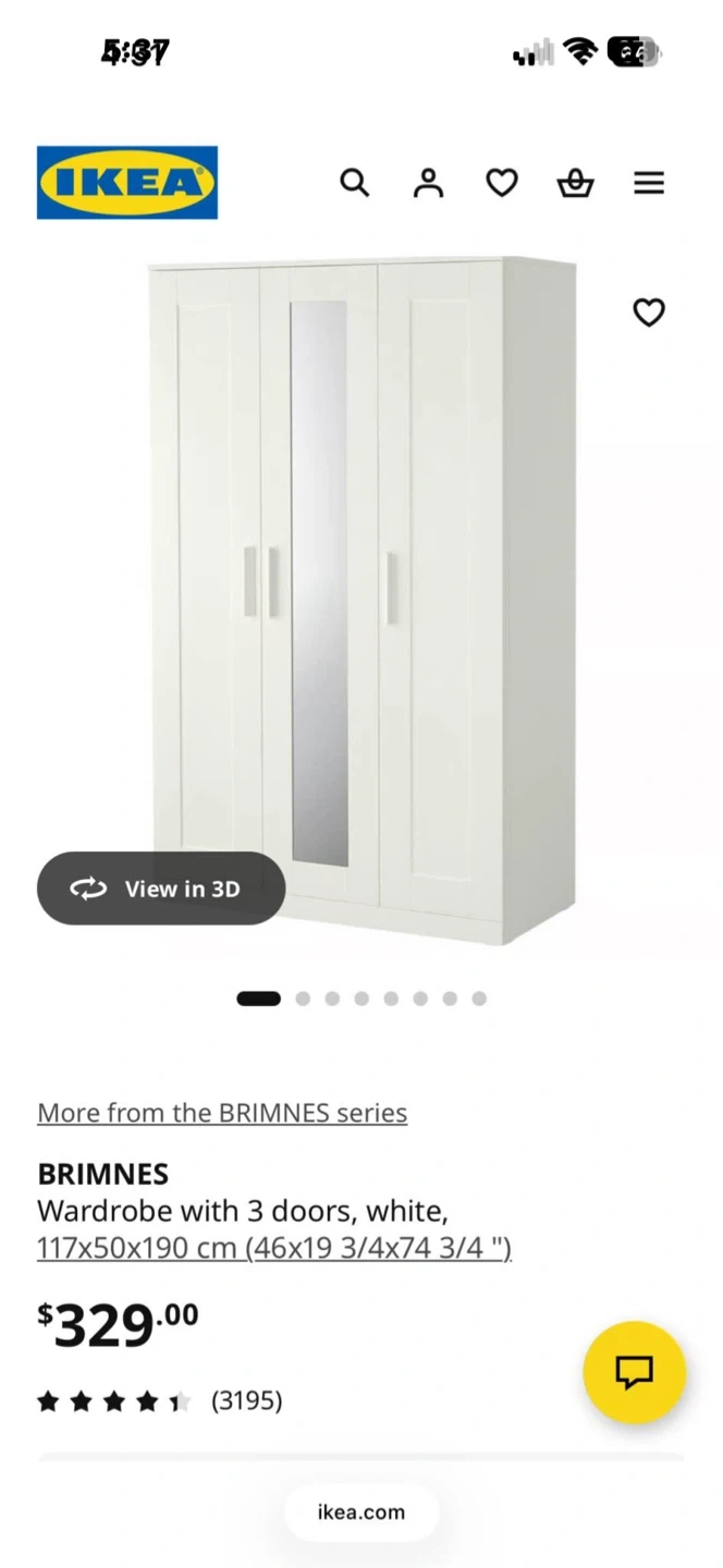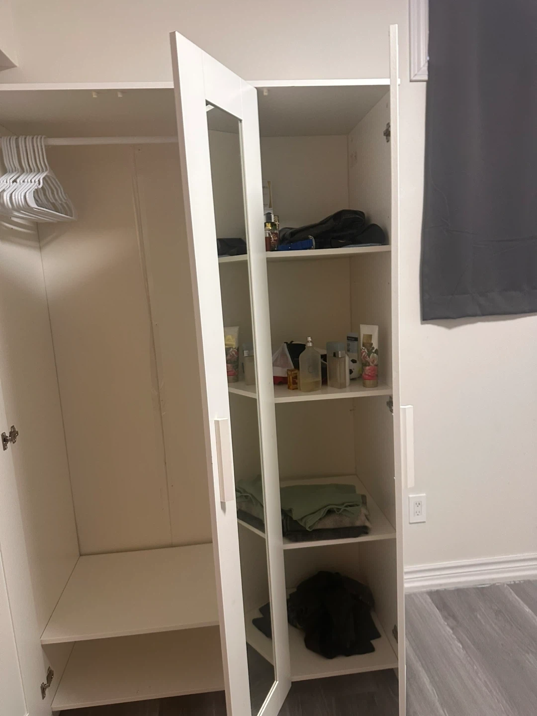 This spacious white wardrobe features three doors, with two of them containing mirrors. It measures 3' 10" wide and stands 6' 1" tall, offering ample hanging and shelf space for your clothing and accessories. It's a practical storage solution for any bedroom!