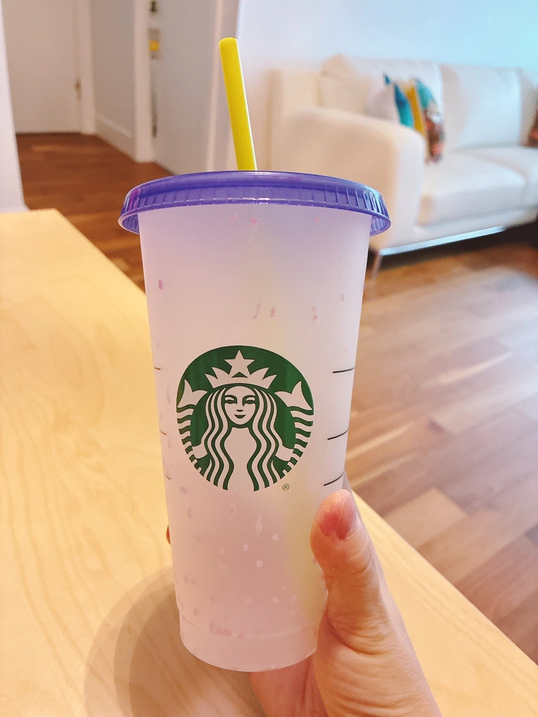 This is a Starbucks Venti cold cup that changes colour. It comes with a reusable purple lid and a yellow straw. Perfect for enjoying your favourite cold beverages on the go!