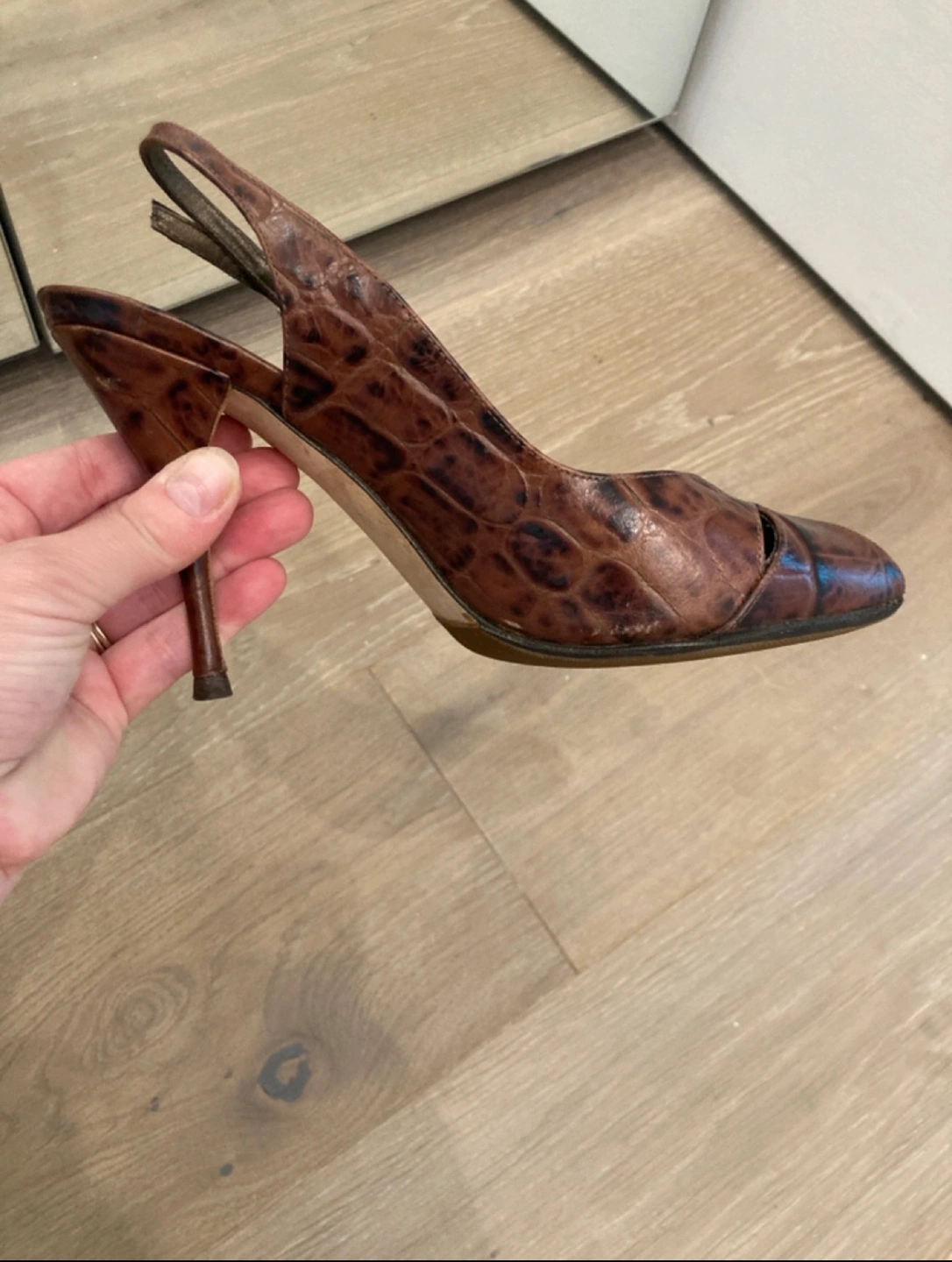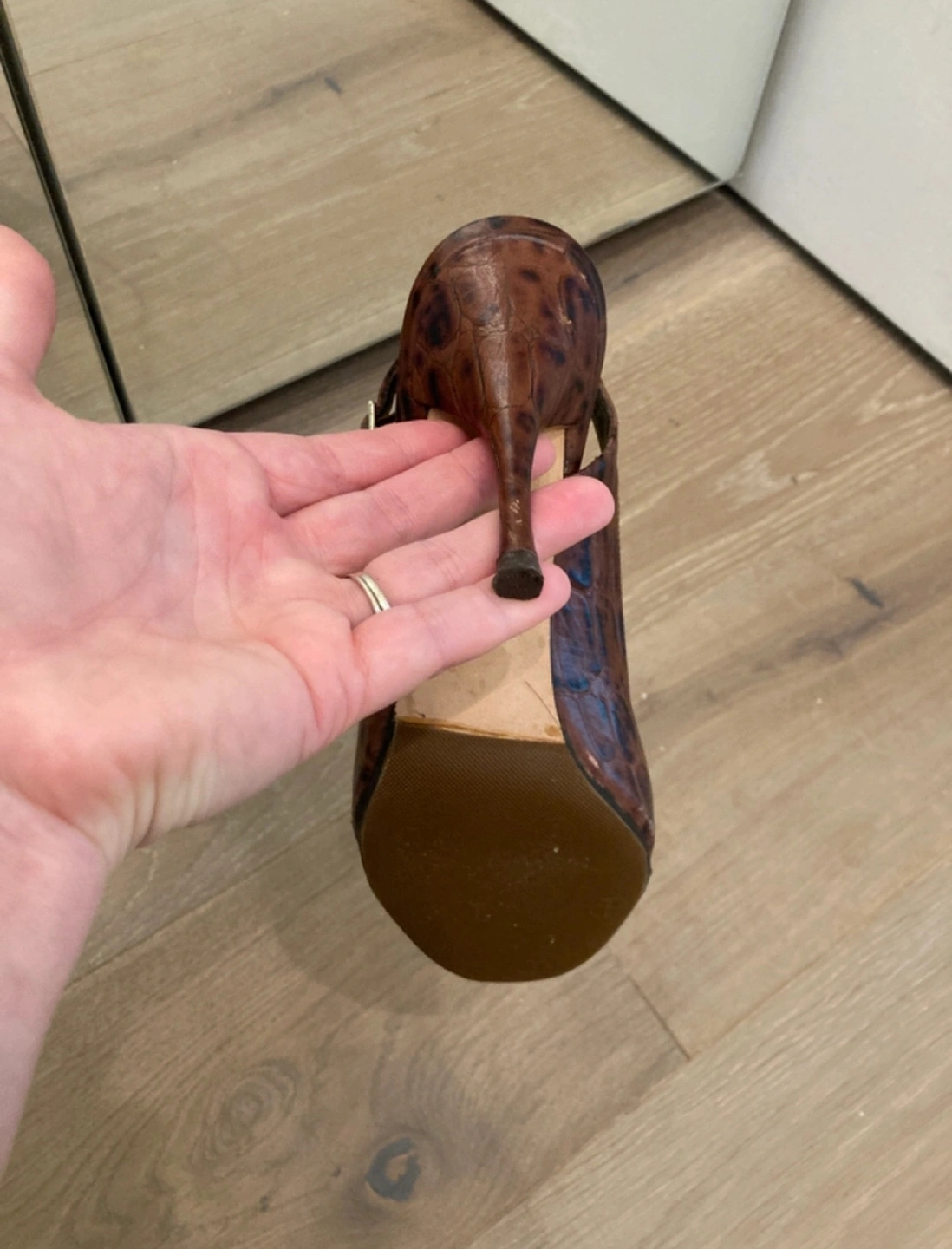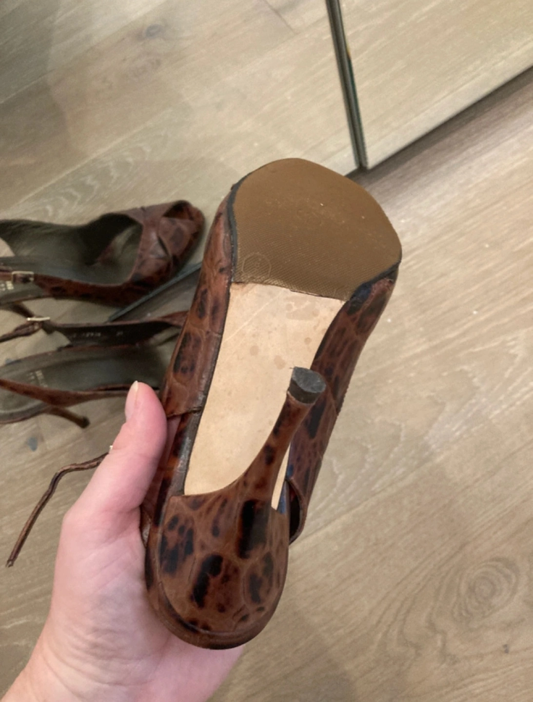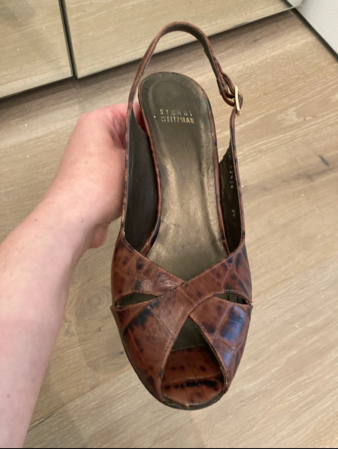 Beautiful Stuart Weitzman high heels, open toe. Size 8 1/2, fits true to size. Have been resoled for extra comfort and longevity. In near perfect condition.