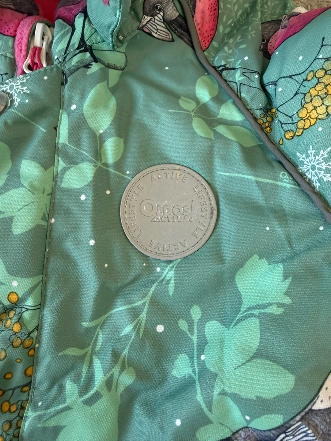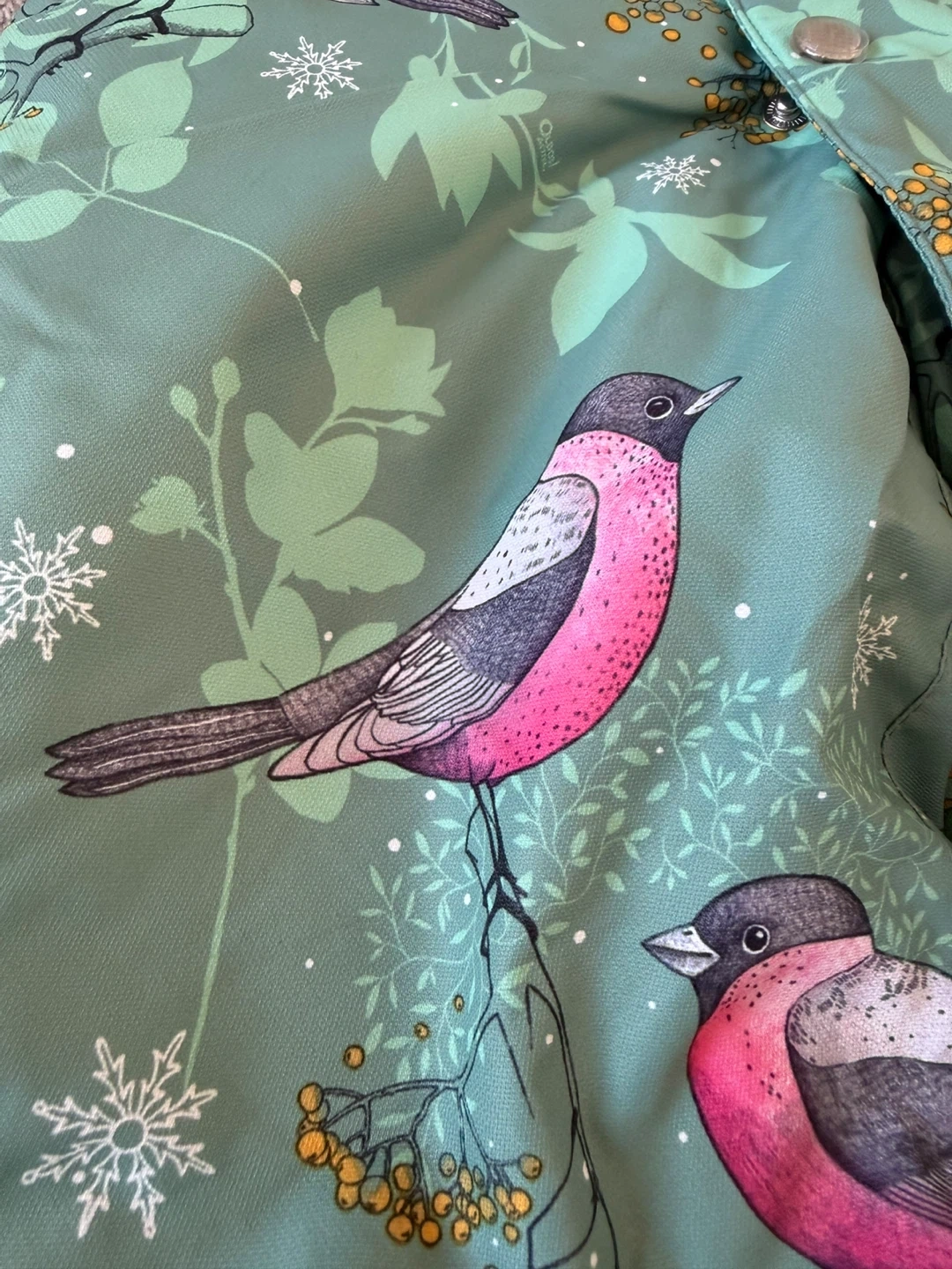 This green snowsuit features a cute bird and botanical print. It includes a hood, elasticated cuffs with stirrups, and a full-zip front. Great for keeping little ones warm and dry during winter adventures!