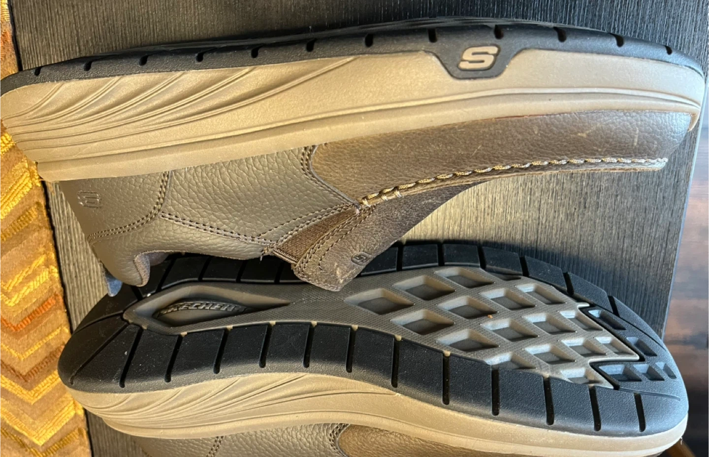 Selling a pair of Skechers Calabrio Bazley men's shoes in brown. They feature an air-cooled relaxed fit and memory foam for extra comfort. Perfect for everyday wear!