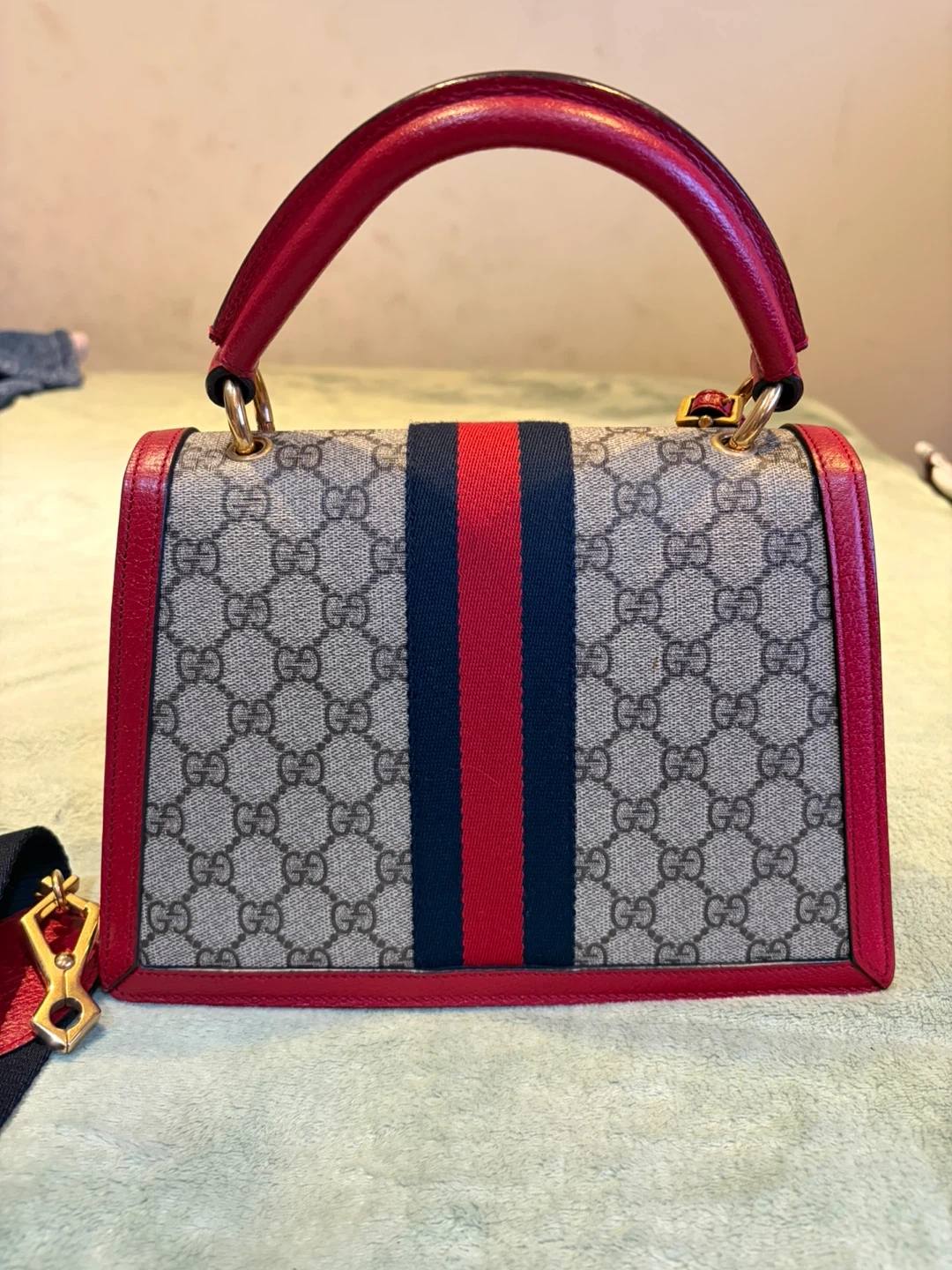 Authentic Gucci Queen Margaret bag in the iconic GG Supreme coated canvas with red leather trim. This stunning piece features the signature antiqued gold-tone bee closure, heavily embellished with pearls and red crystals.