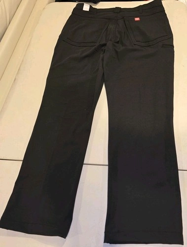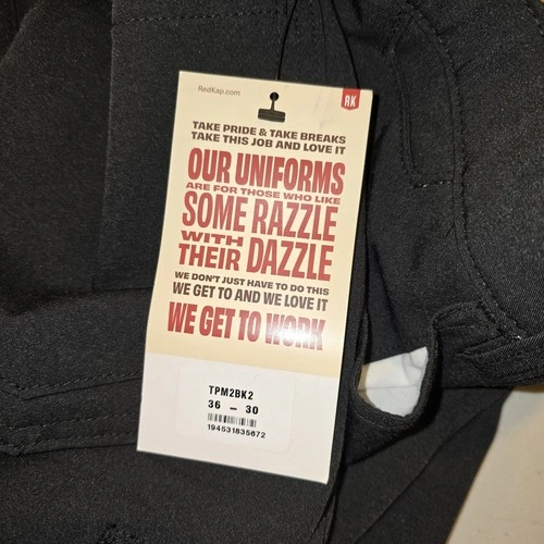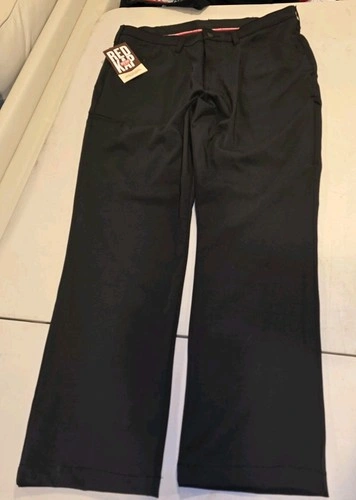 2 pairs of new with tags Red Kap cooling work pants in black, size 36x30. These pants feature a zip and button closure, a mid-rise fit, and a straight leg style. Made of a lightweight and breathable microfiber fabric, they are designed for comfort and quick dry with added stretch for flexibility. The pants also have slash pockets and are water-resistant, making them ideal for summer, fall, and spring seasons. The chino style and classic black color make them suitable for workwear occasions, while the Red Kap brand ensures quality and durability.