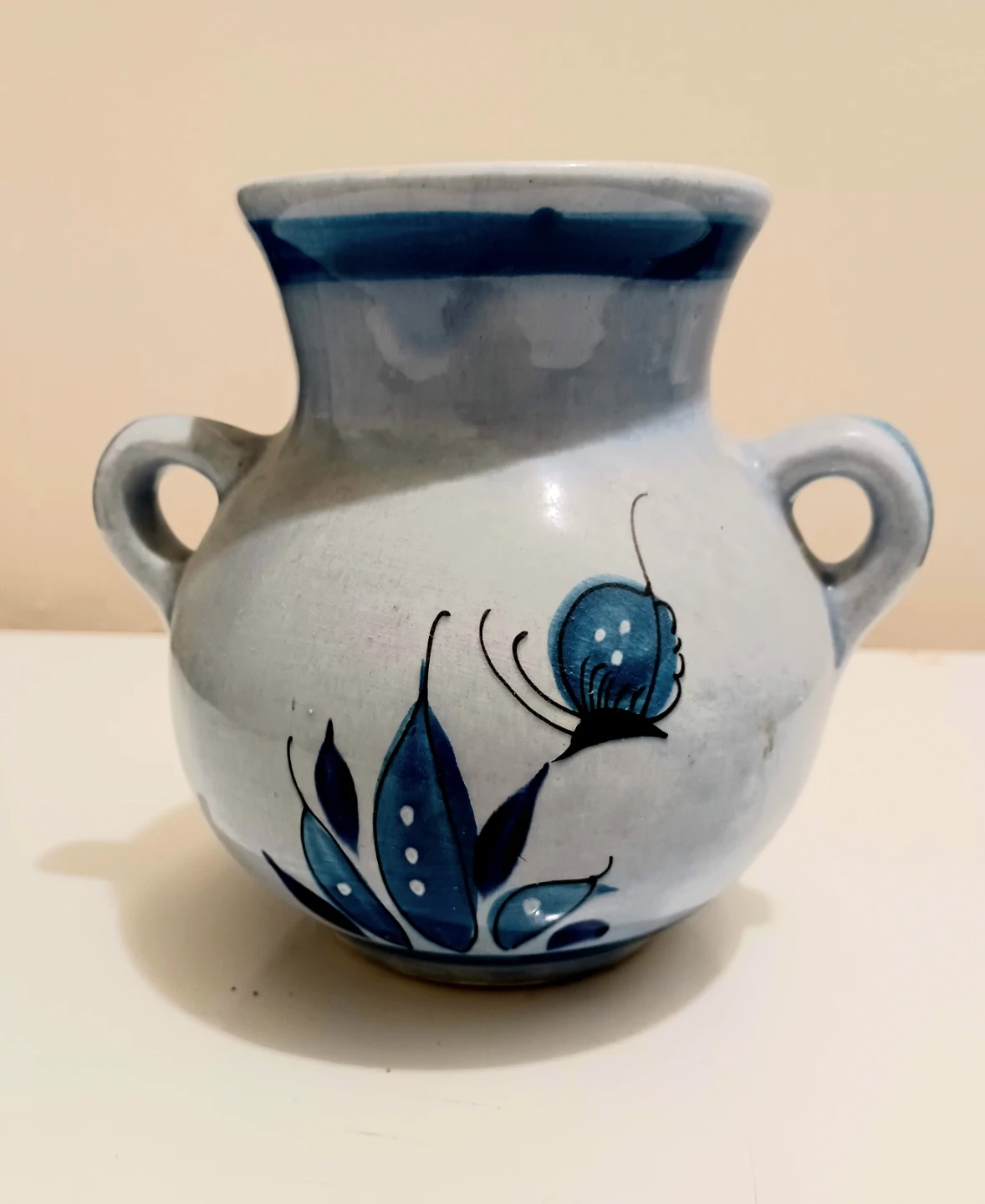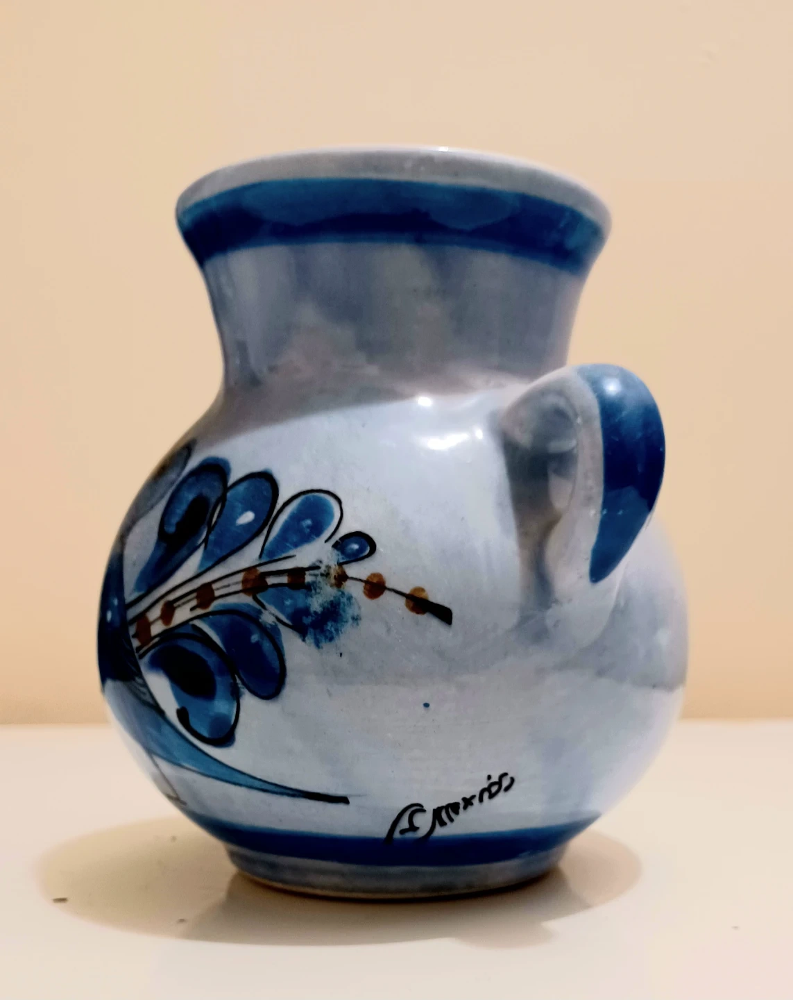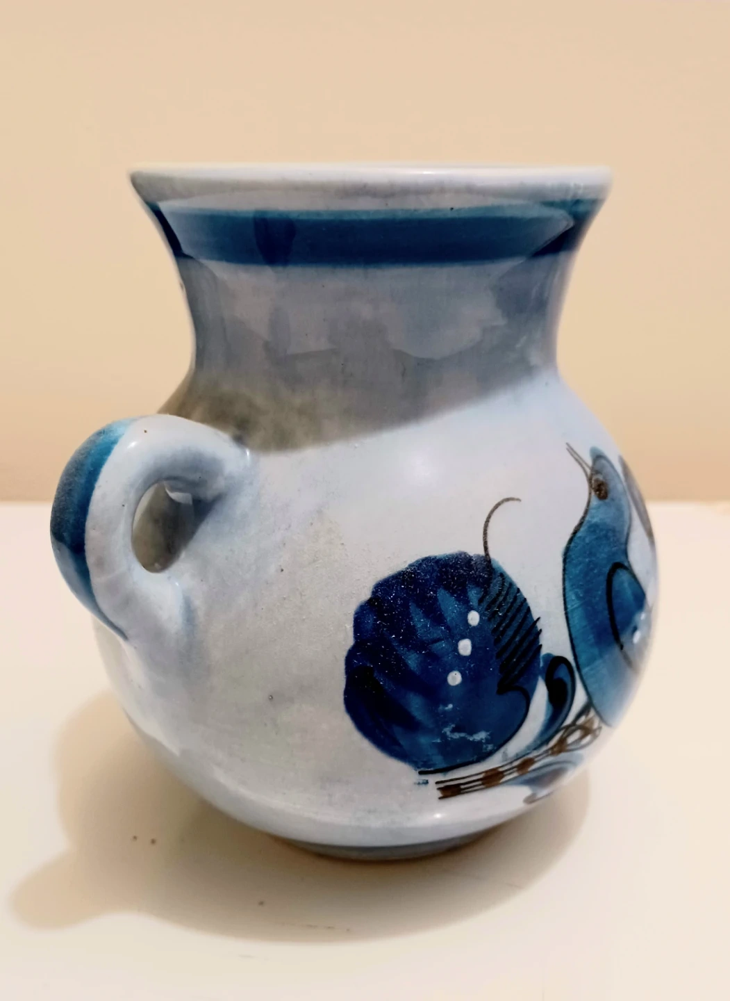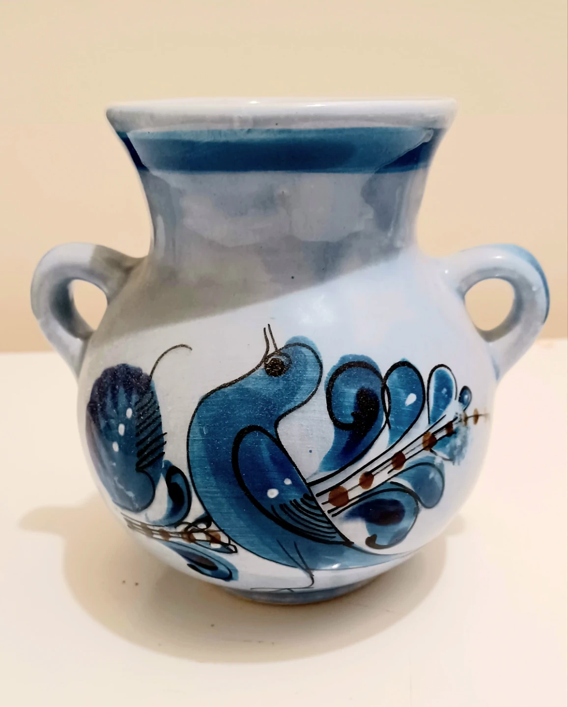 This charming, vintage Tonalá Mexico pottery vase features a beautiful blue bird and floral design, perfect for adding a touch of artisanal decor to your home. This vase is in great shape, showcasing traditional Mexican craftsmanship.
