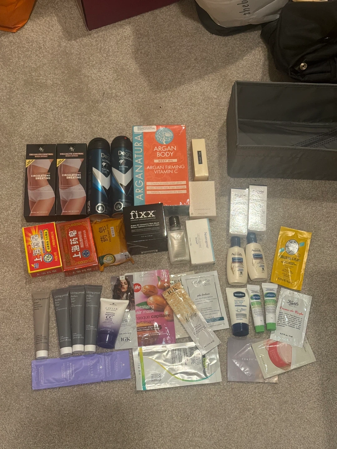 A collection of body sprays, skincare samples, and hair mask sachets. Includes brands like Arganatura, Fixx, Living Proof, and Kiehl's. Mostly sample sizes and travel-sized items for your personal care routine.