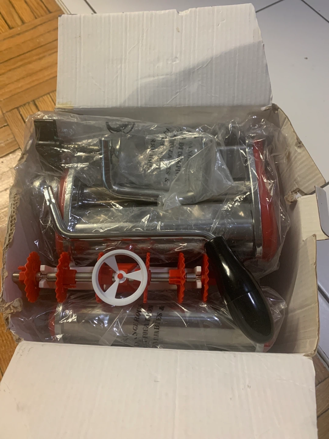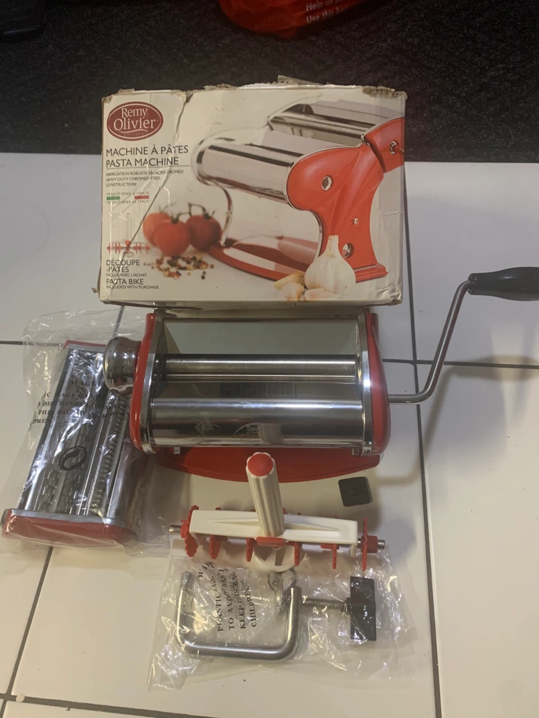 This Remy Olivier pasta machine is red and comes with various attachments for different pasta shapes. It includes the main machine, a crank handle, a C-clamp for securing it to a counter, and a separate attachment with rollers. It's great for making fresh pasta at home!