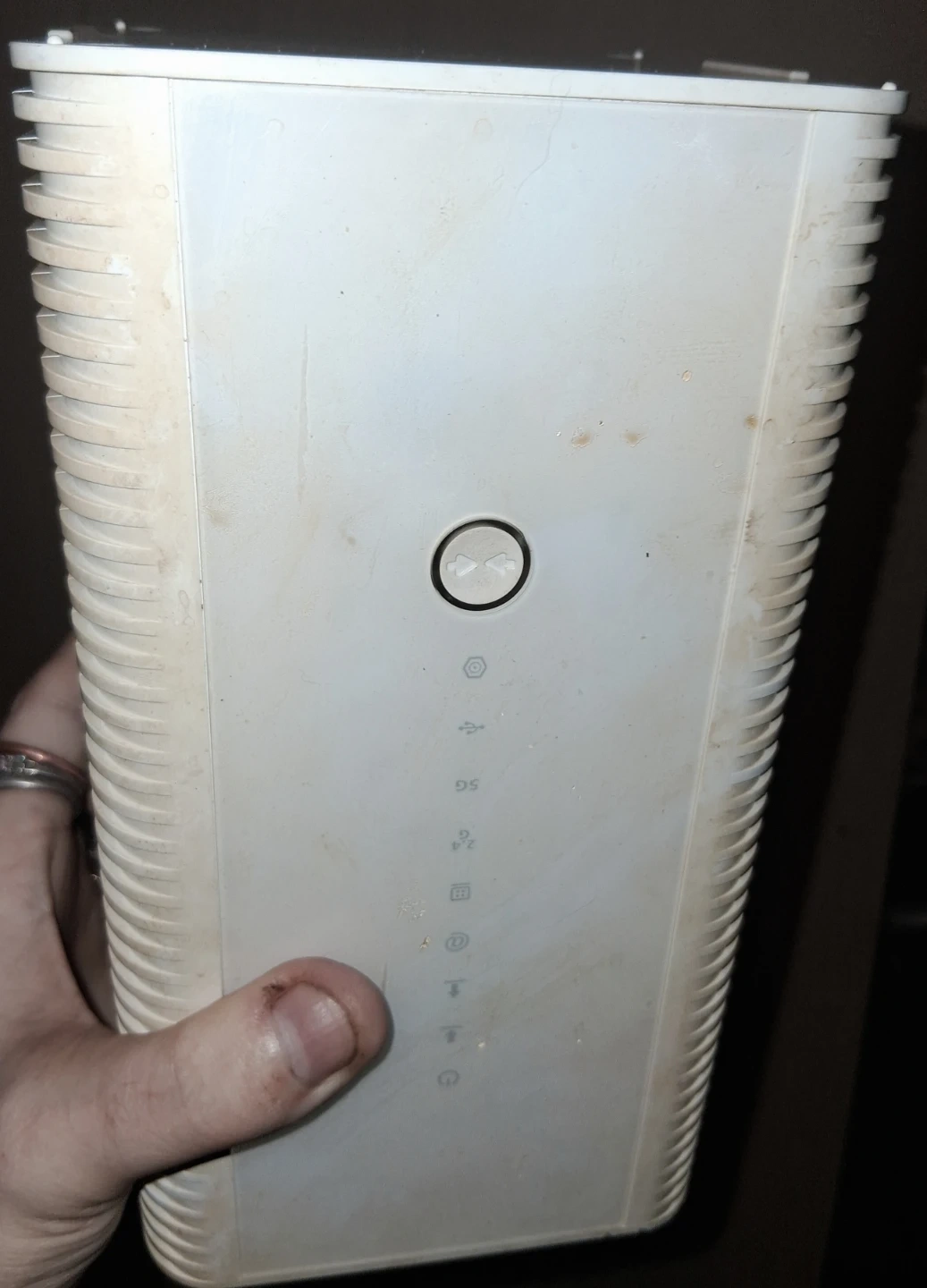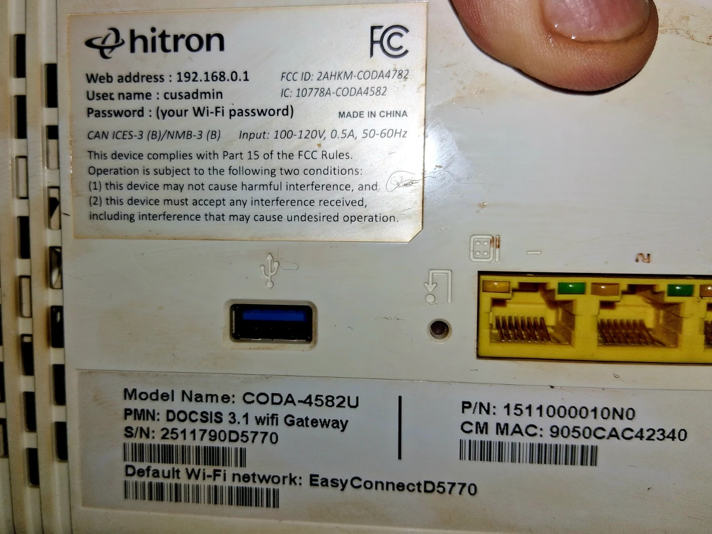 Free. This is a Hitron DOCSIS 3.1 wifi gateway. It supports input from 100-120V at 0.5A, 50-60Hz. The default Wi-Fi network name is EasyConnectD5770. Not much else is known of it. Does it work, I don't know. Pick up only unless near the intersection of Oxford and Gammage Street.