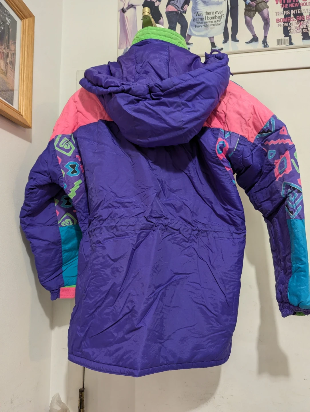 This is a vintage ski jacket in a size 14. It's made of nylon and features a fun, colourful 80s-inspired design. Multiple pockets and a hood are included. This jacket is perfect for hitting the slopes or for anyone who loves retro winter fashion!