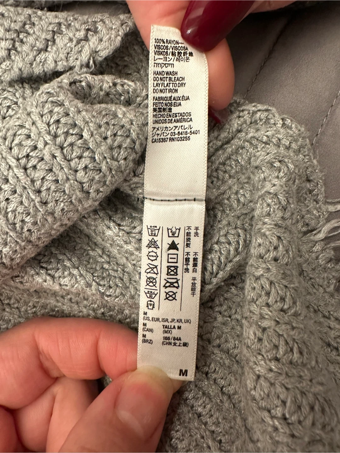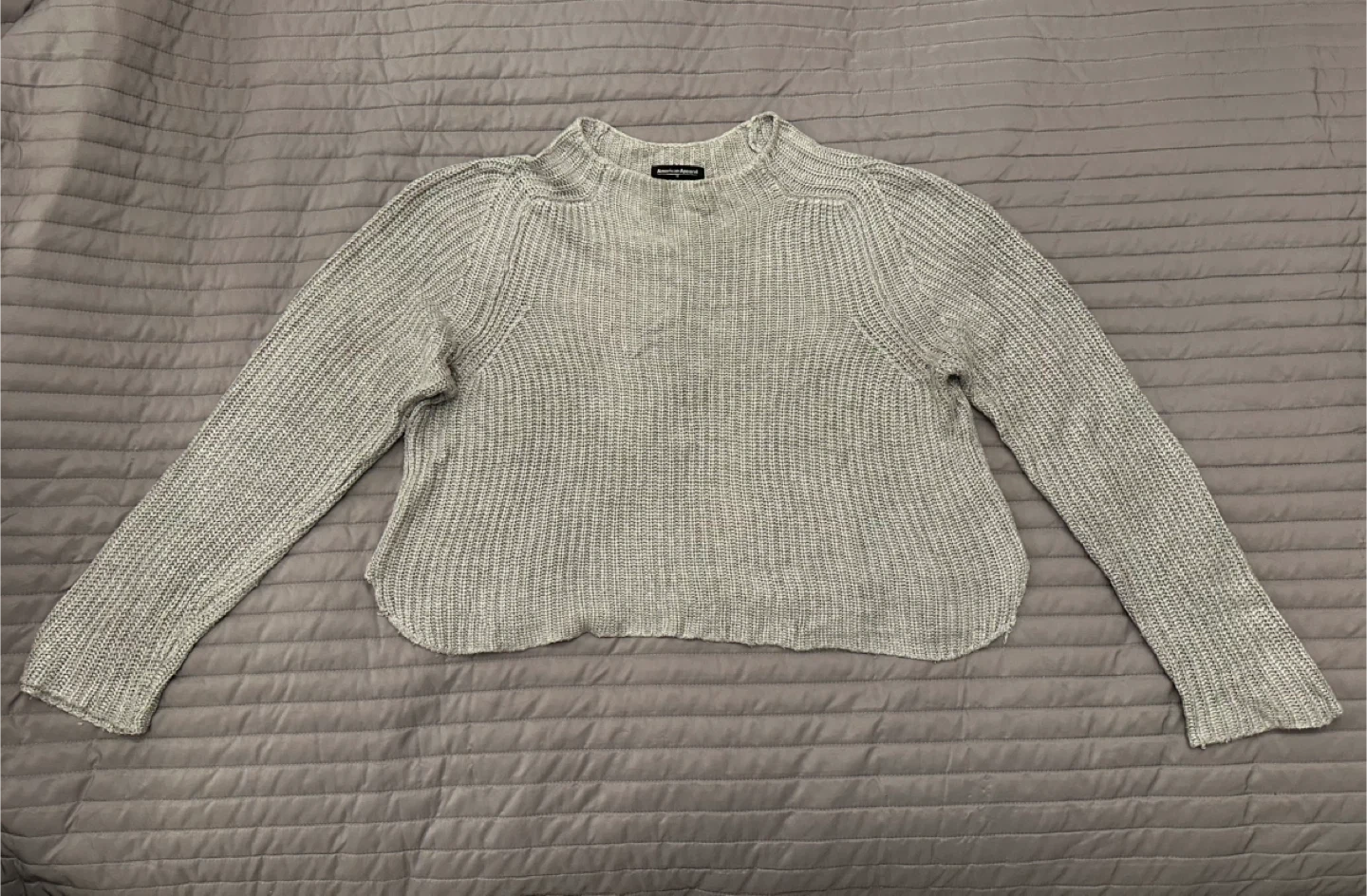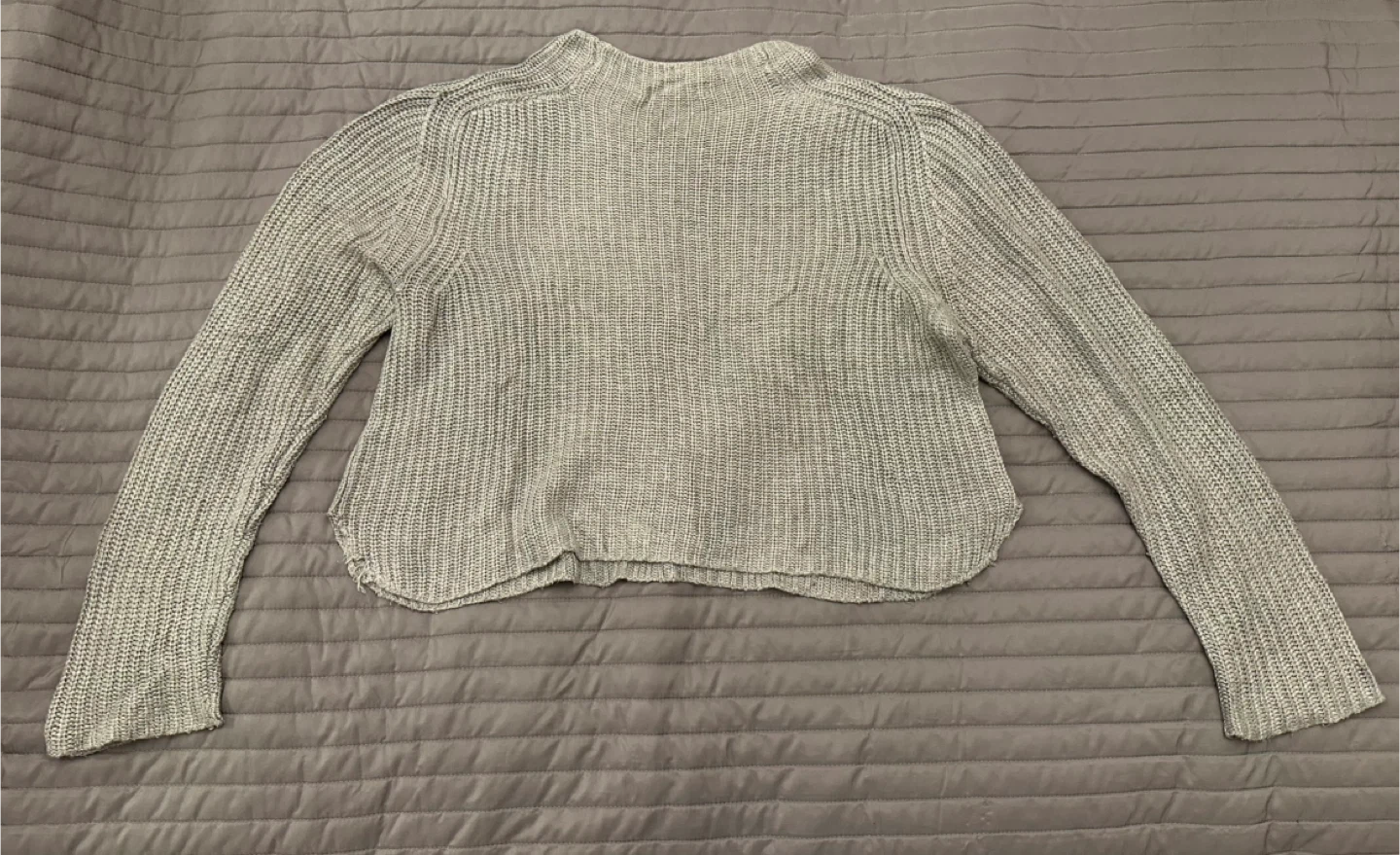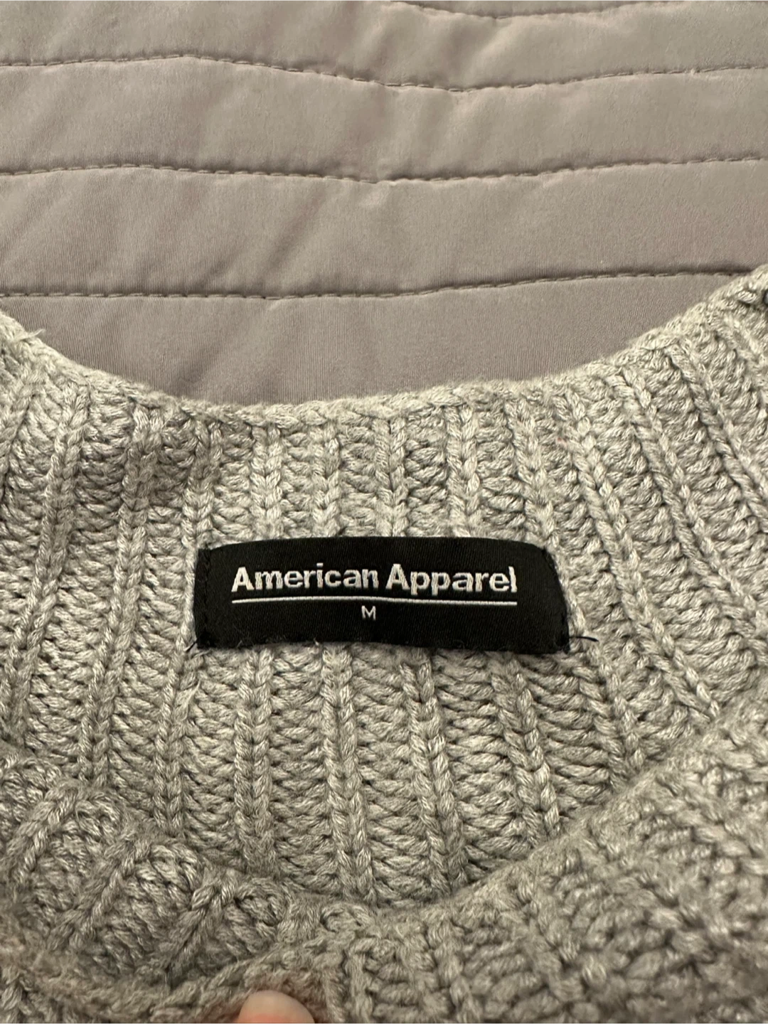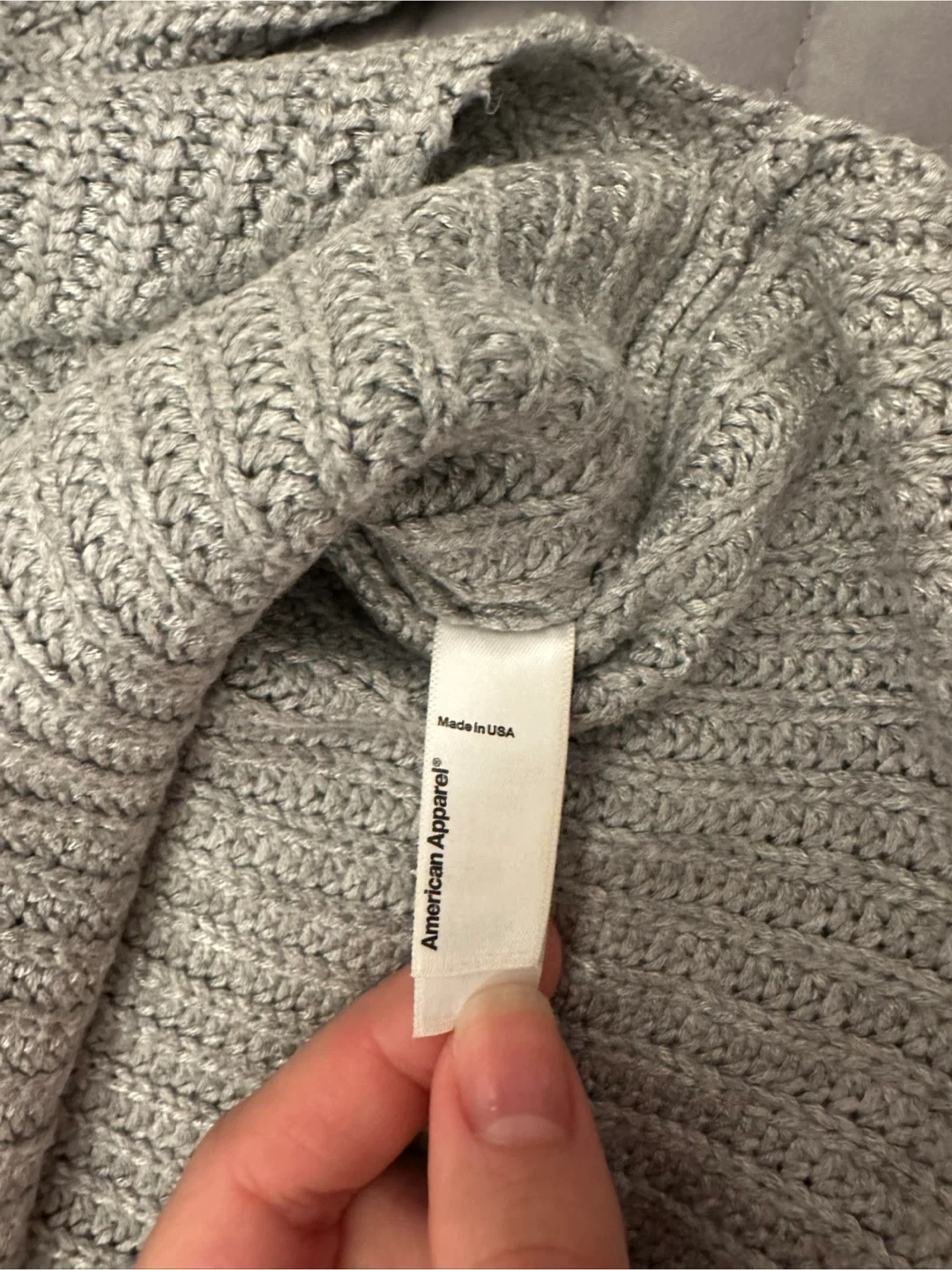 This grey American Apparel knit sweater is made of 100% Rayon and is a size medium. It has a ribbed texture and is a little bit cropped.