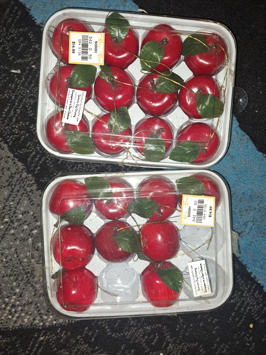Set of 24 red apple Christmas ornaments. Ornaments are approximately 2 inches in diameter. Includes gold string for hanging. Price for all. Pick up at Vista Gardens NE