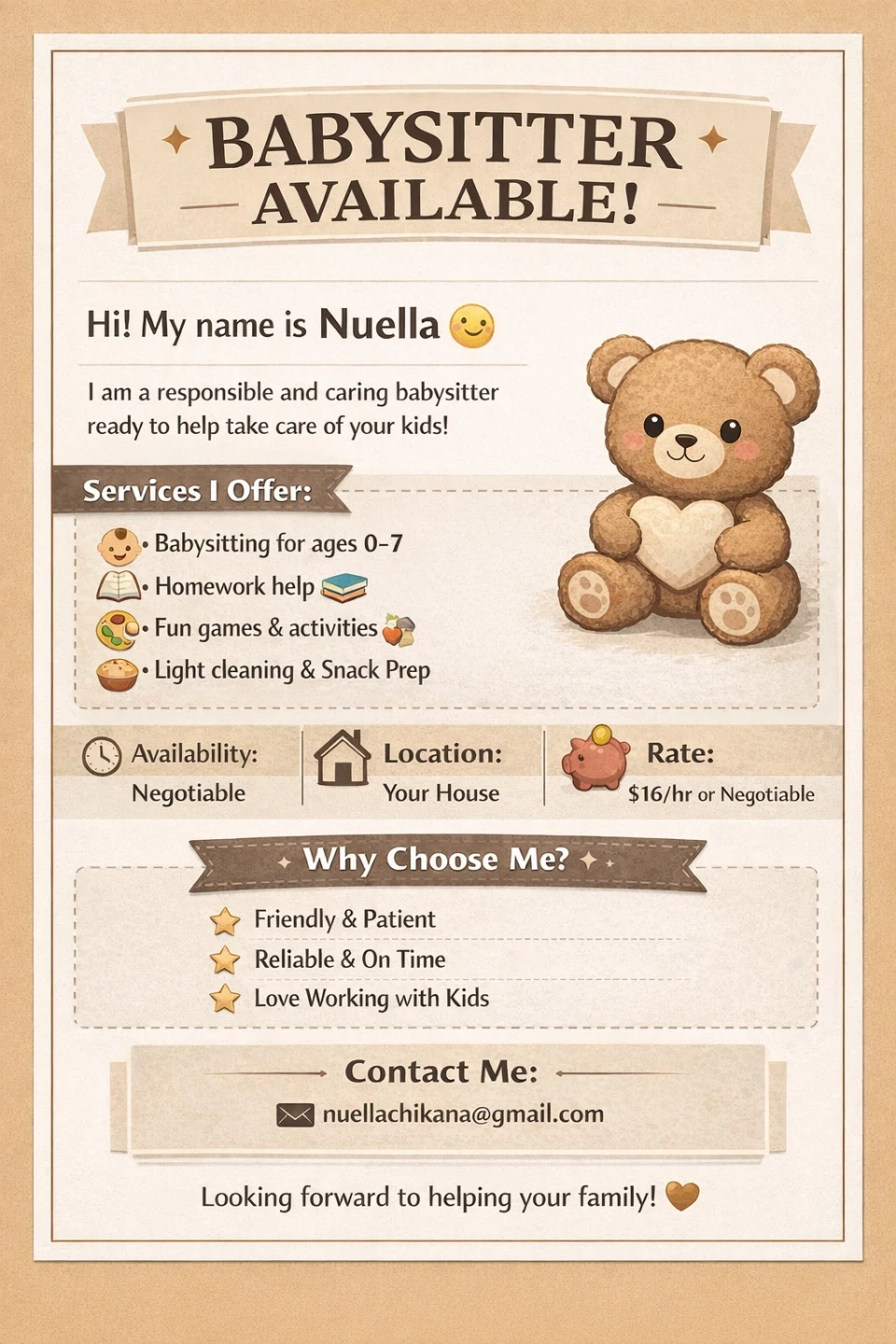 Babysitter available for ages 0-7. Services include homework help, fun games, light cleaning, and snack prep. Rate is $16/hr or negotiable.