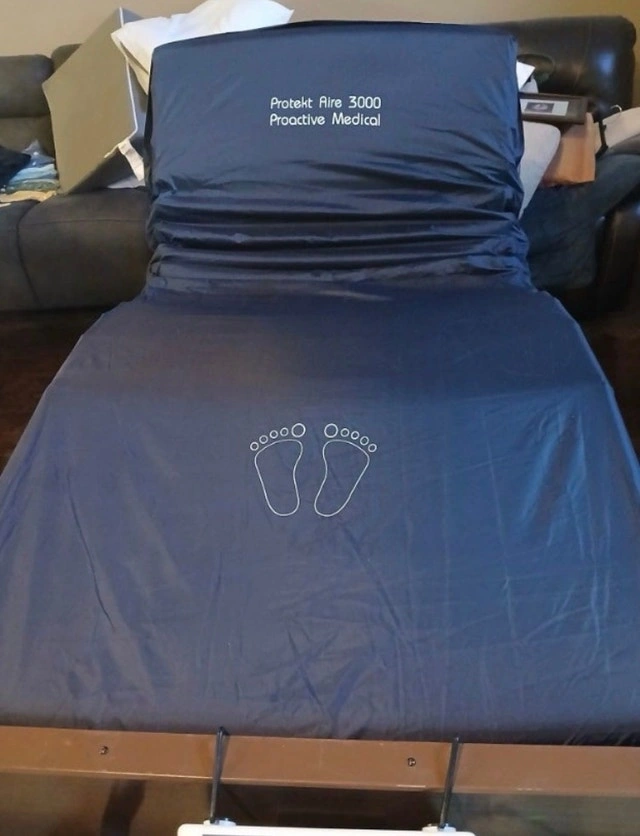 For sale is a BRAND NEW (unused & unopened in box) low-air-loss pressure mattress and customizable pump, great for bedsore prevention and care. This mattress uses alternating air cell technology to relieve pressure points, so no more rotating the patient – the mattress does it for you. The pump is whisper quiet. This is an American-made mattress. Make: Protekt Model: 3000. It provides alternating pressure and low air loss for pressure redistribution, shear/friction reduction, and microclimate control, ideal for home use. The 20 air bladders can be customized for desired firmness. Dimensions are 36”x 80” with an 8” height. An electric adjustable bed is also available for an extra $300. Free delivery and setup is available for the mattress. Message for any questions.