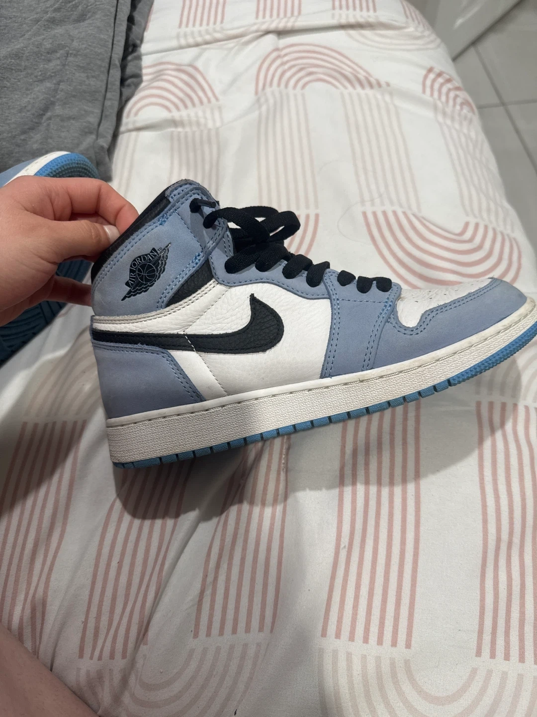 Nike Air Jordan 1 High sneakers in "University Blue" colorway. White and blue leather upper with black accents. These shoes are a high-top silhouette. Features the iconic Jordan Wings logo on the ankle.