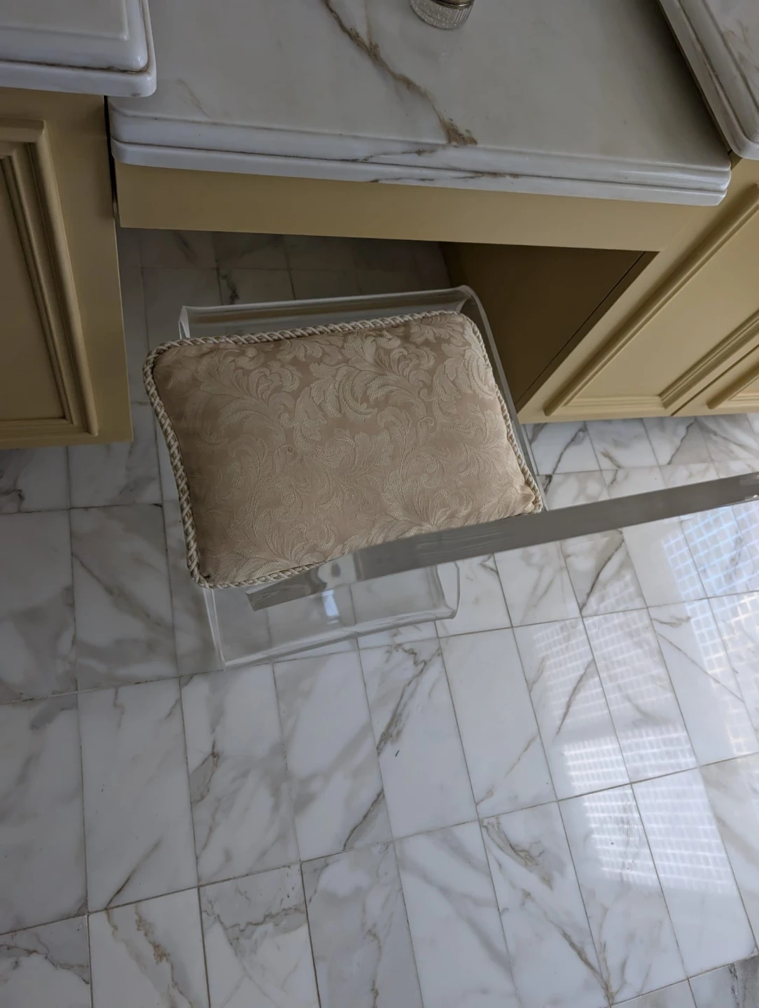 Stylish clear acrylic vanity chair featuring a comfortable, upholstered seat with a damask pattern. Its sleek design complements any modern or classic vanity setup. Perfect for a bedroom or bathroom space.