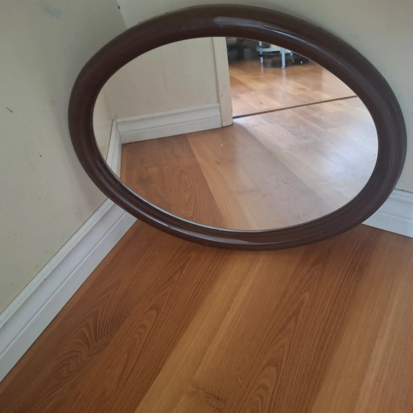 A simple oval mirror with a dark brown plastic frame. The back has clips for mounting.
