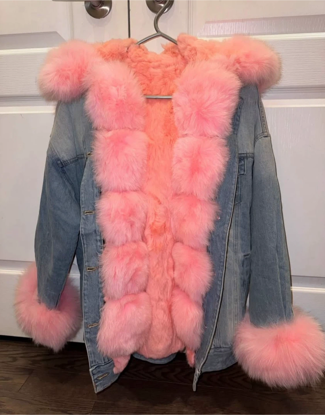 Denim jacket with a soft pink faux fur lining and trim. Features distressed detailing and fur cuffs. It's a statement piece for cooler weather!