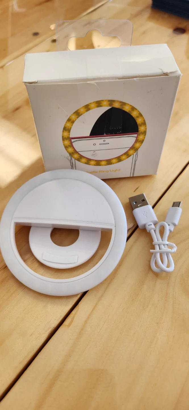 This is a clip-on ring light designed for phones. It's perfect for improving selfies and videos. The light has multiple LEDs for bright illumination. Includes charging cable.