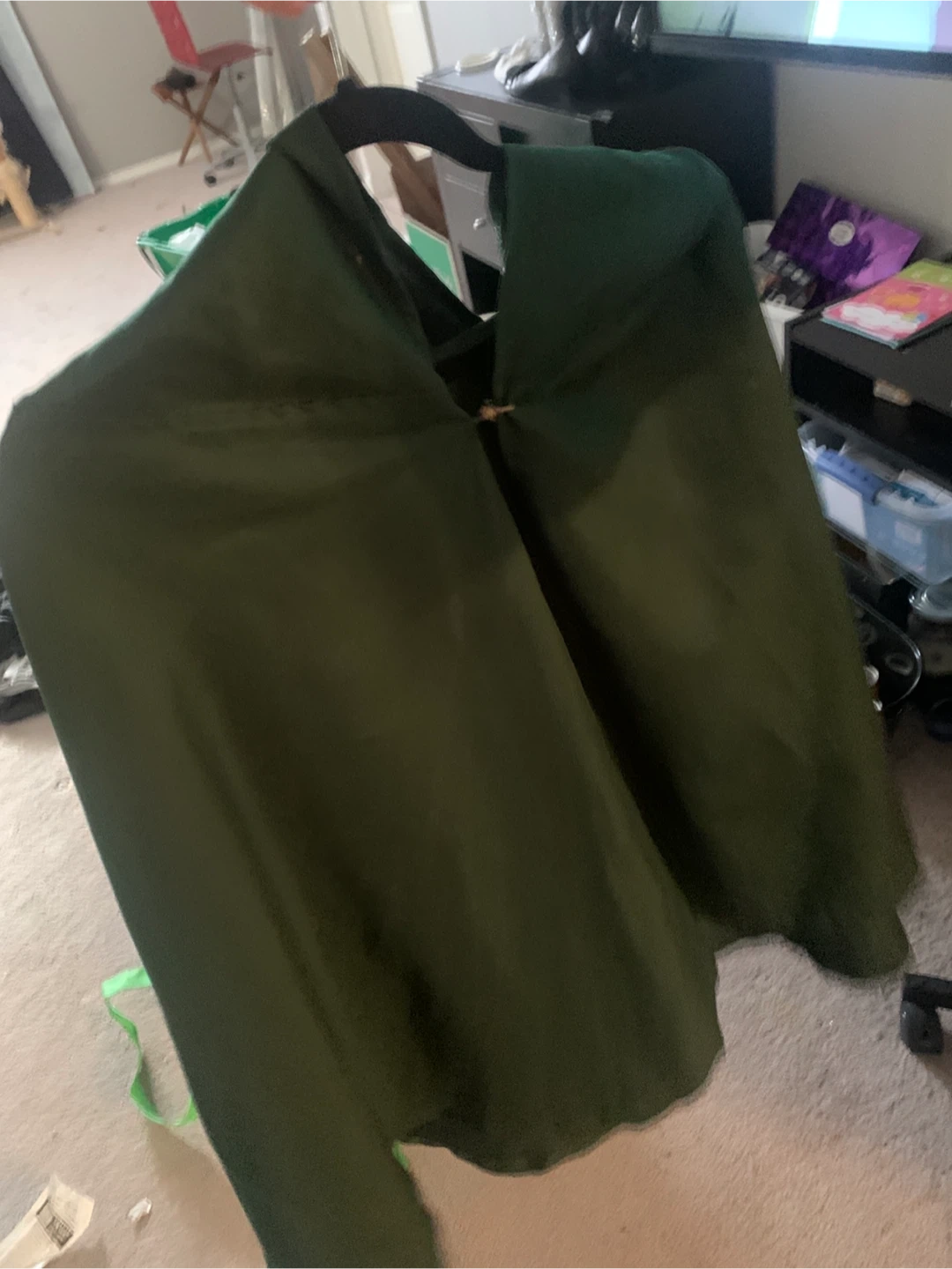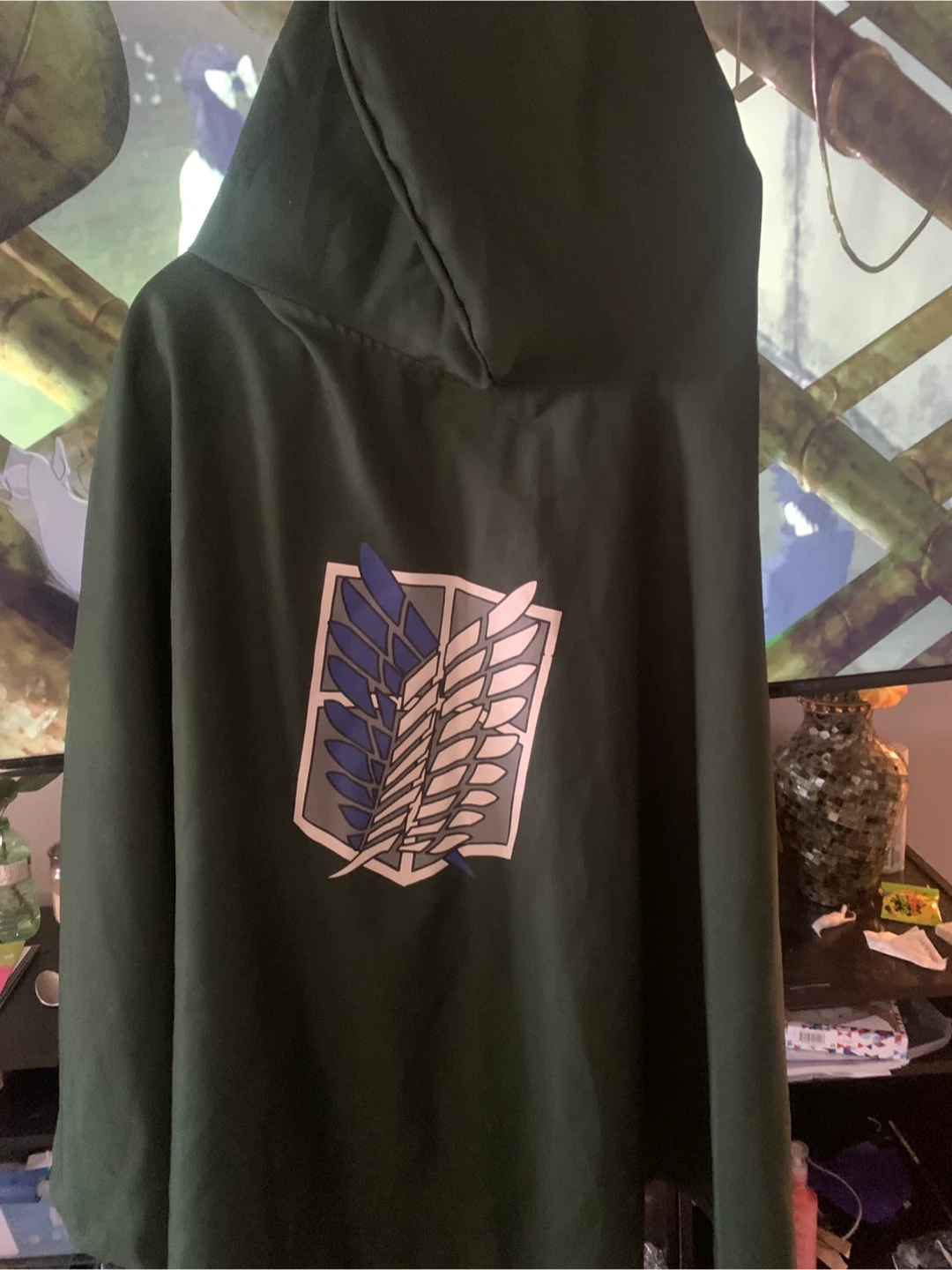 Green hooded cloak with the Survey Corps wings emblem. Fastens with a simple clasp at the neck. Great for conventions or costume parties!
