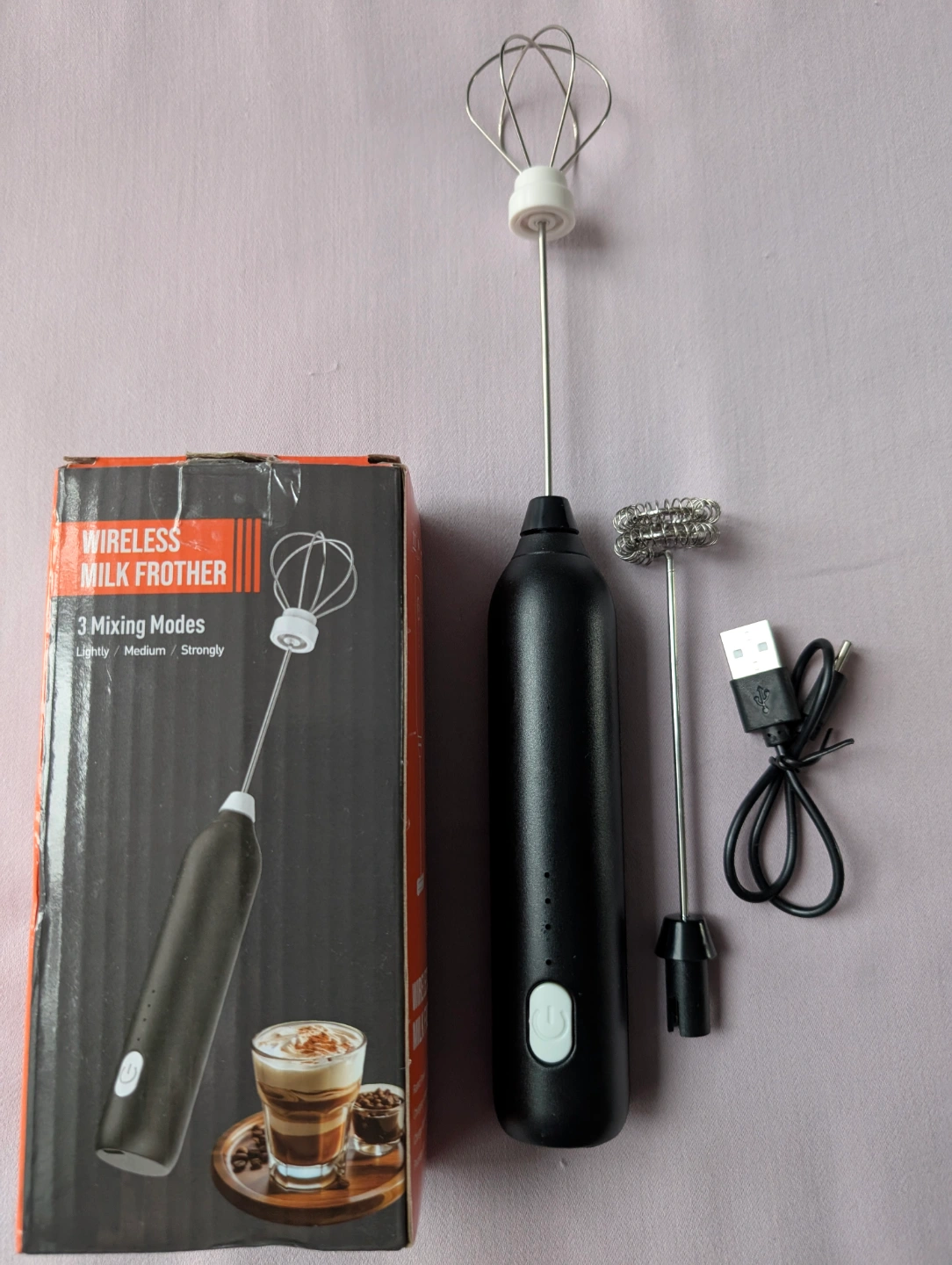 Cordless milk frother. Three mixing modes: light, medium, strong. Includes USB charging cable and extra whisk attachment. Great for coffee and other drinks.