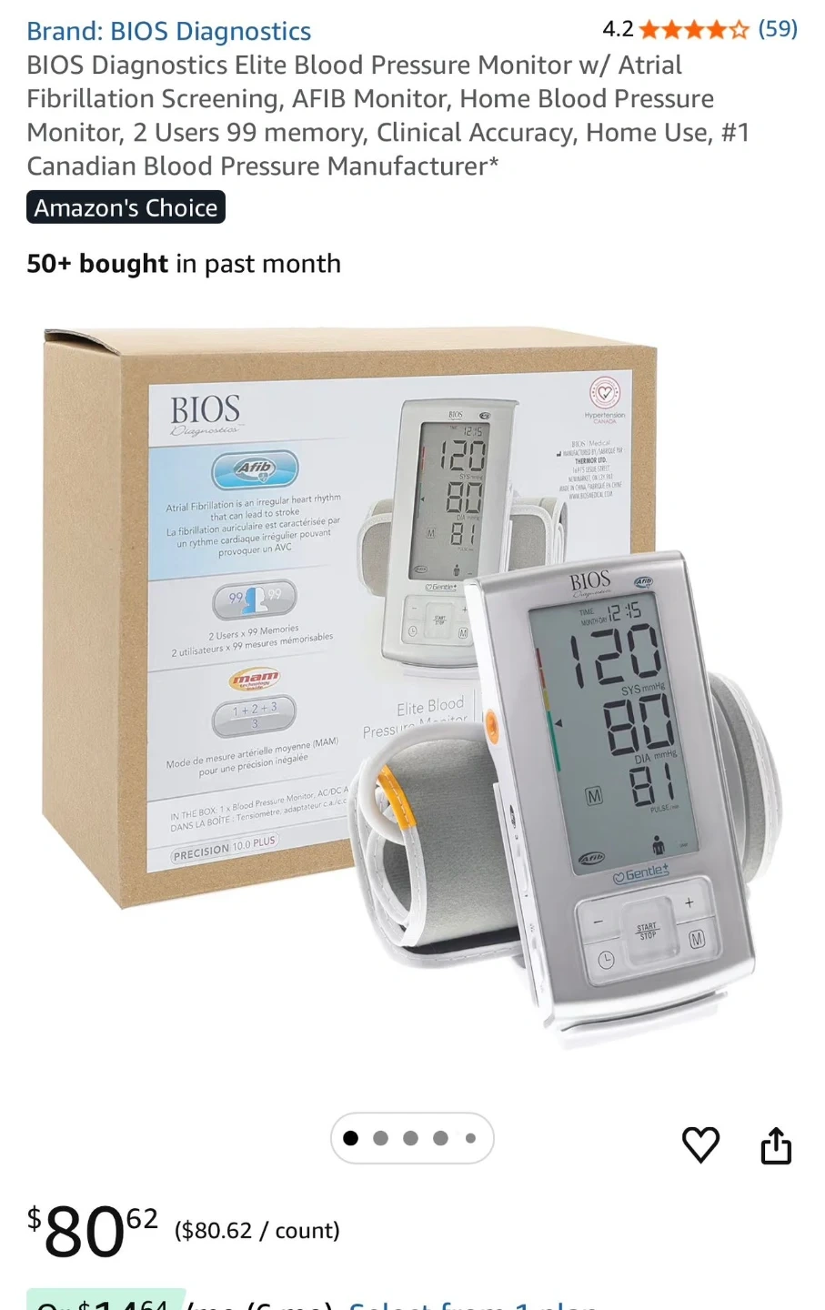 BIOS Diagnostics Elite Blood Pressure Monitor. Features include 2 users x 99 memories and patented averaging mode (MAM technology). The wide-range rigid cuff fits 22cm-42cm (8.7"-16.5"). Includes AC/DC adapter, 4 x AAA batteries, and instruction manual.