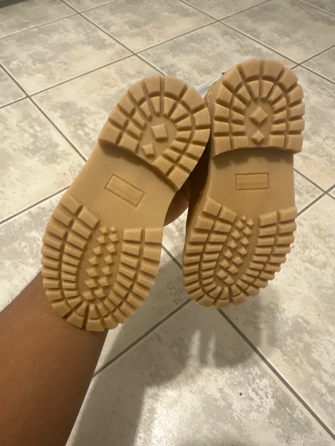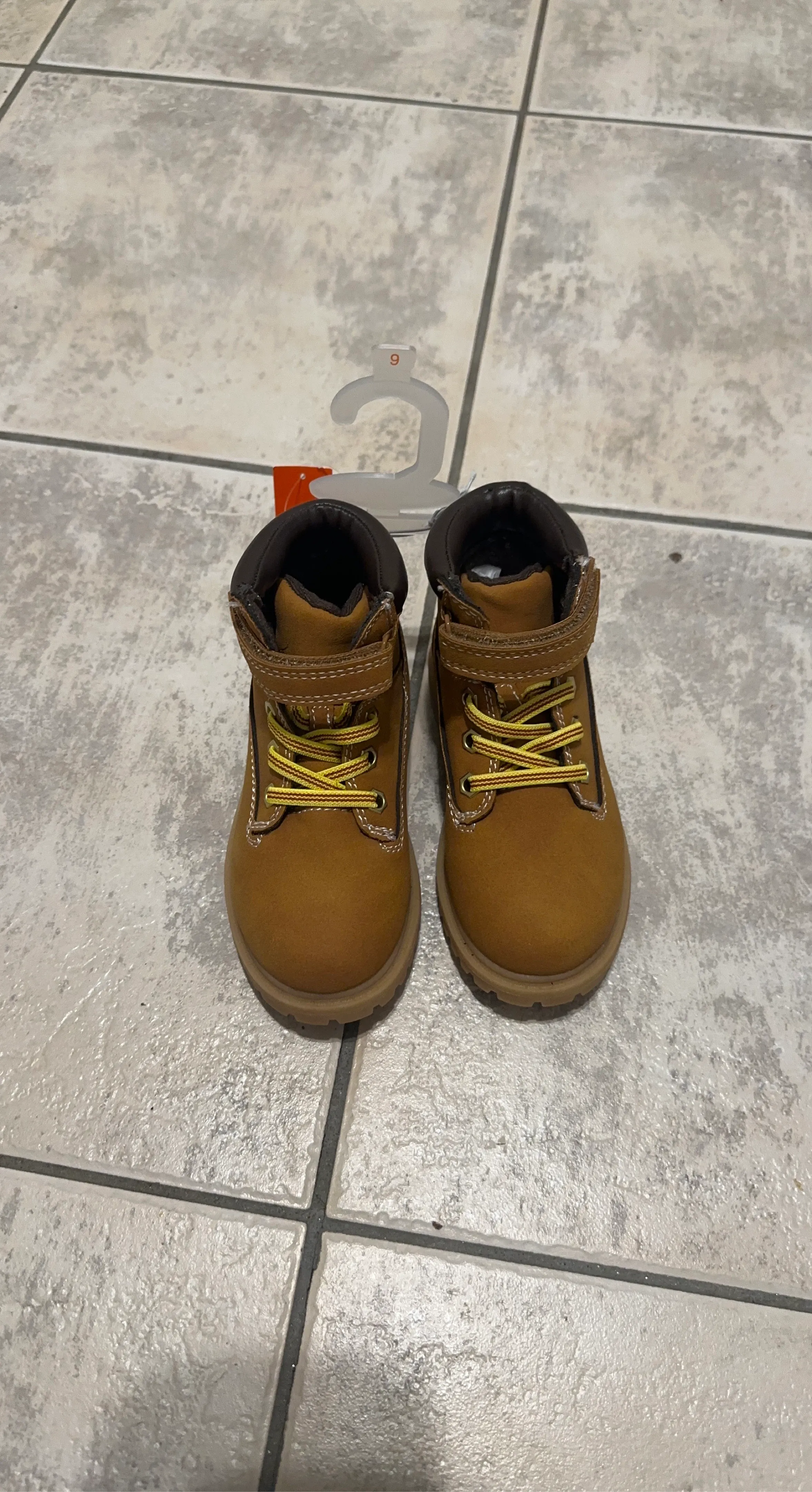 Children's brown boots with yellow laces and a hook-and-loop strap. These boots are size 9 and have a durable sole. They're perfect for little adventurers out playing!