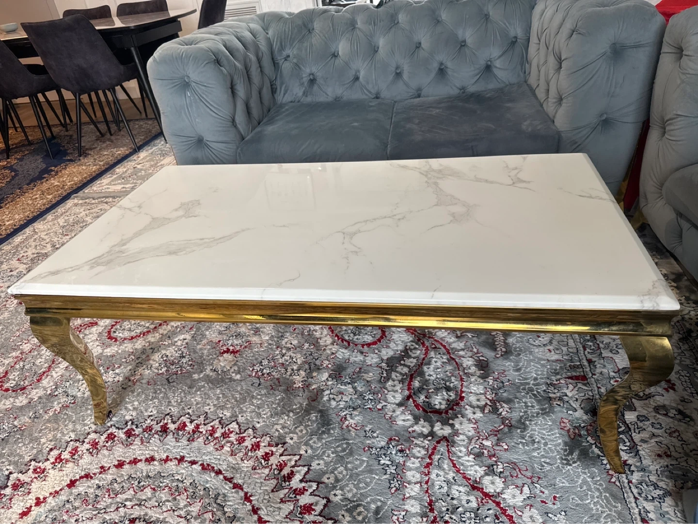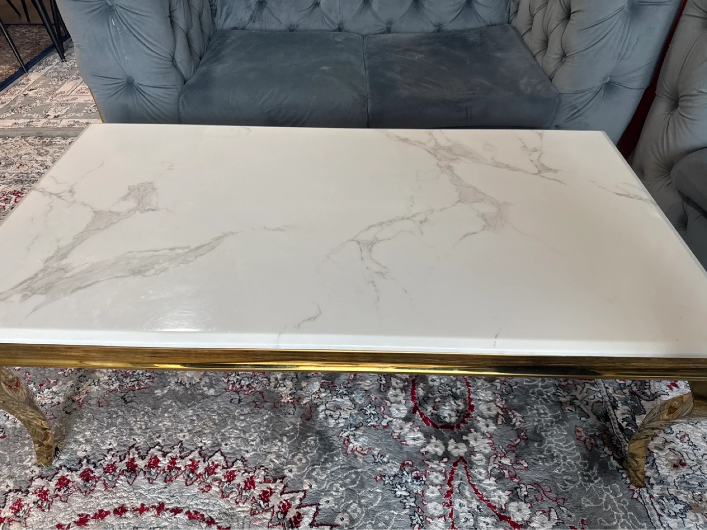 This coffee table has a stylish white marble top with grey veining. It's supported by a gold-toned metal frame and ornate legs. Adds a touch of elegance to any living space!